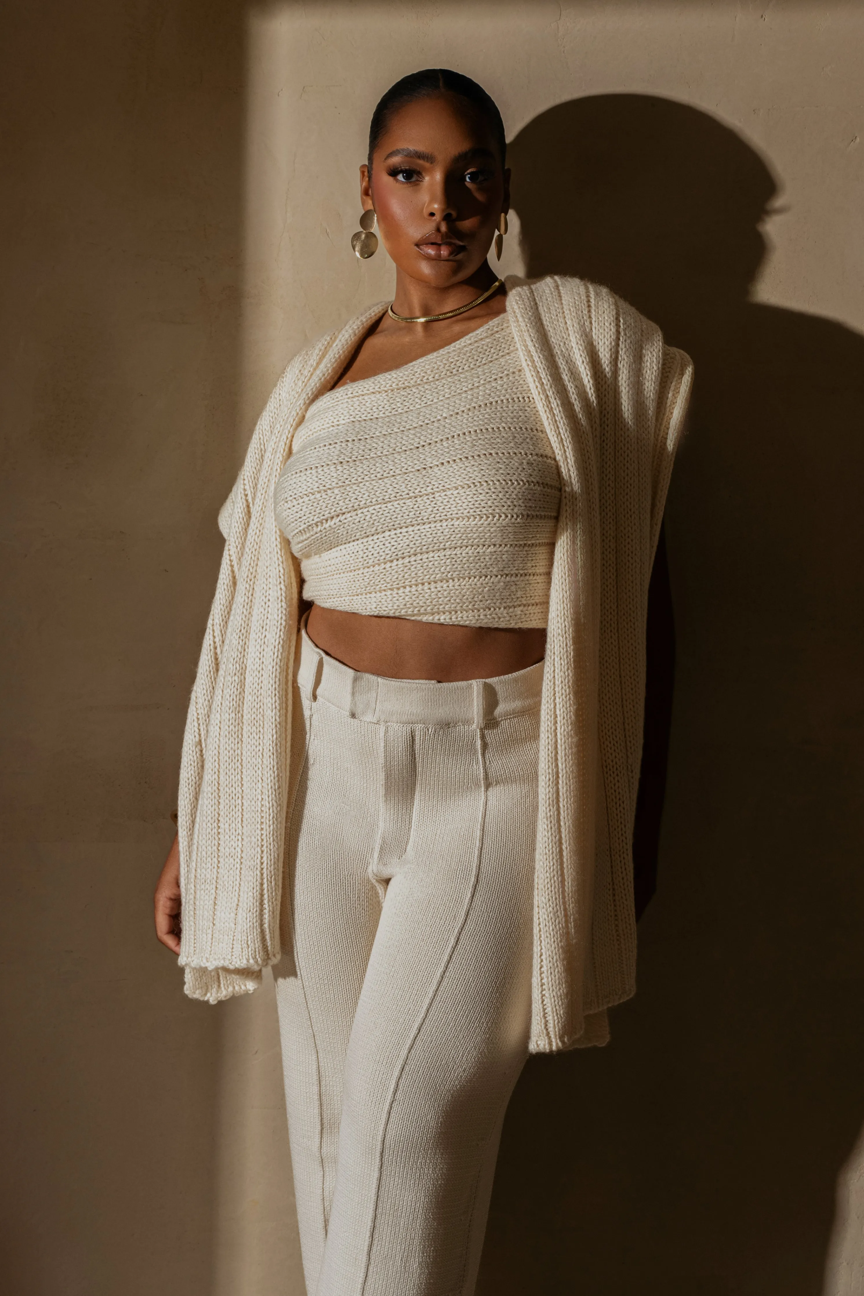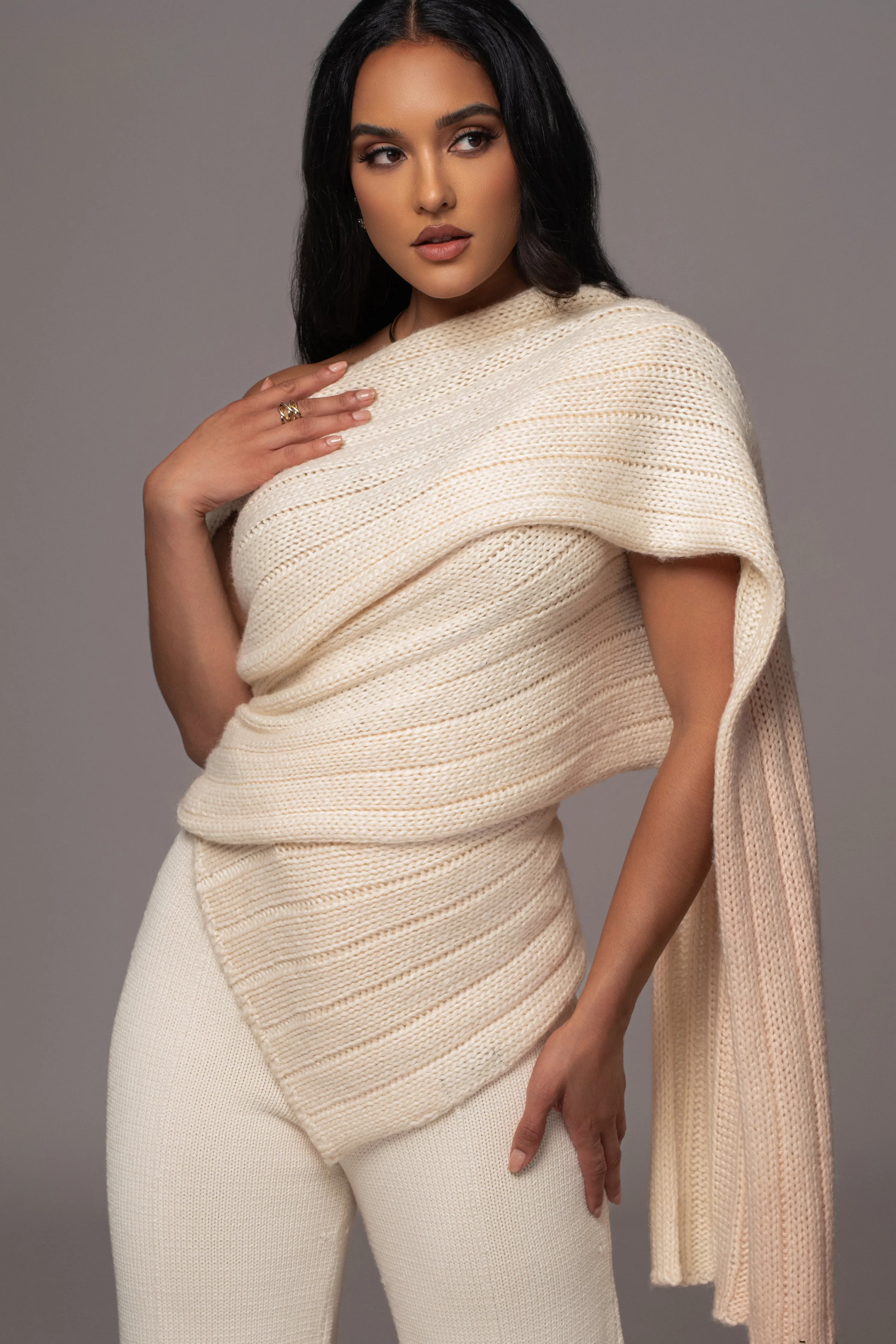 Enhance your Fall wardrobe with ourIvory Soft Life Sweater Knit Cable Top, designed for limitless styling options. Crafted from a soft cable knit fabric, this versatile wrap top allows for multiple styling variations, including a scarf-inspired neckline that elegantly drapes across the front. Pair with our Back In Business Knit Trousers for the full look. Single lined. Stretchy.