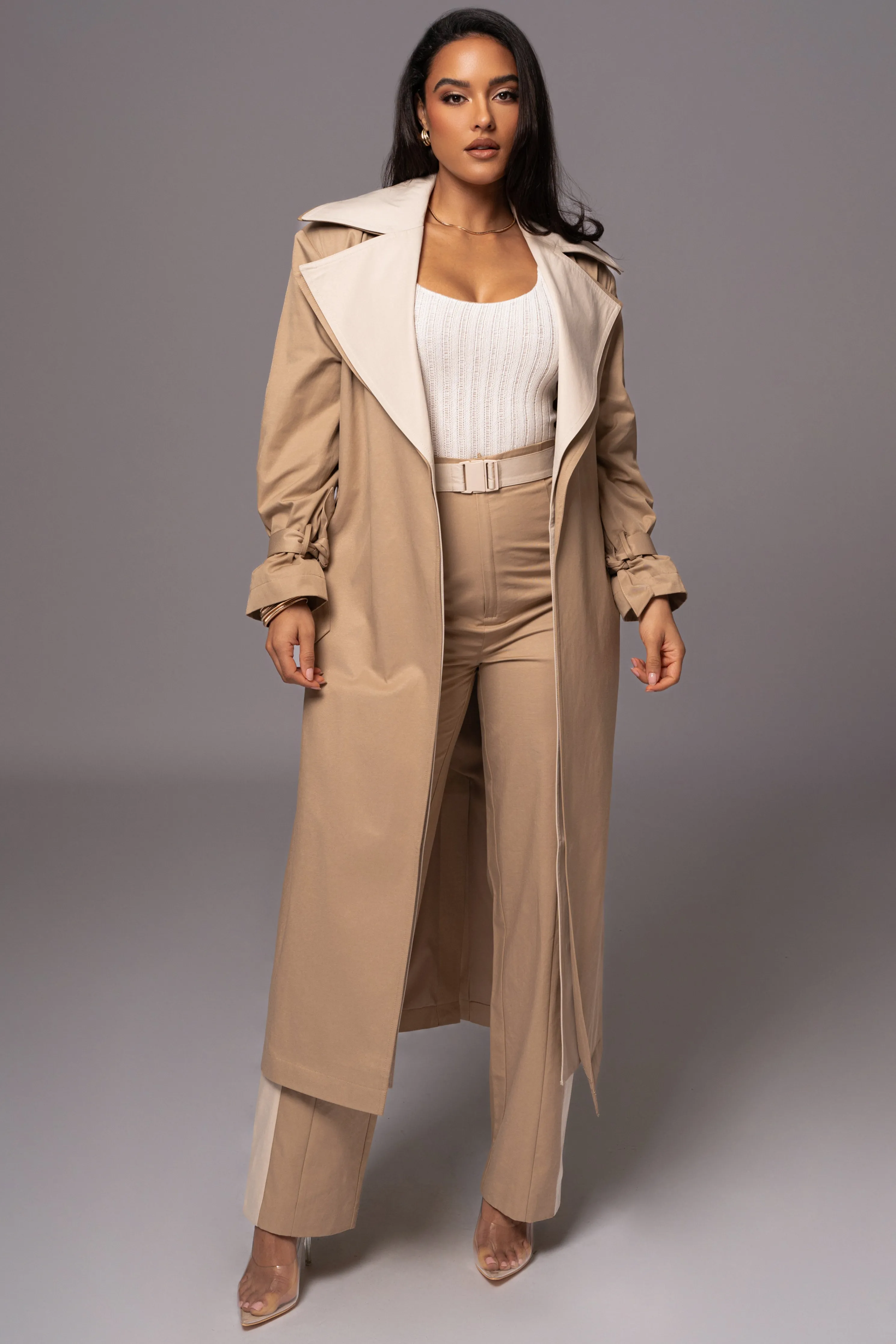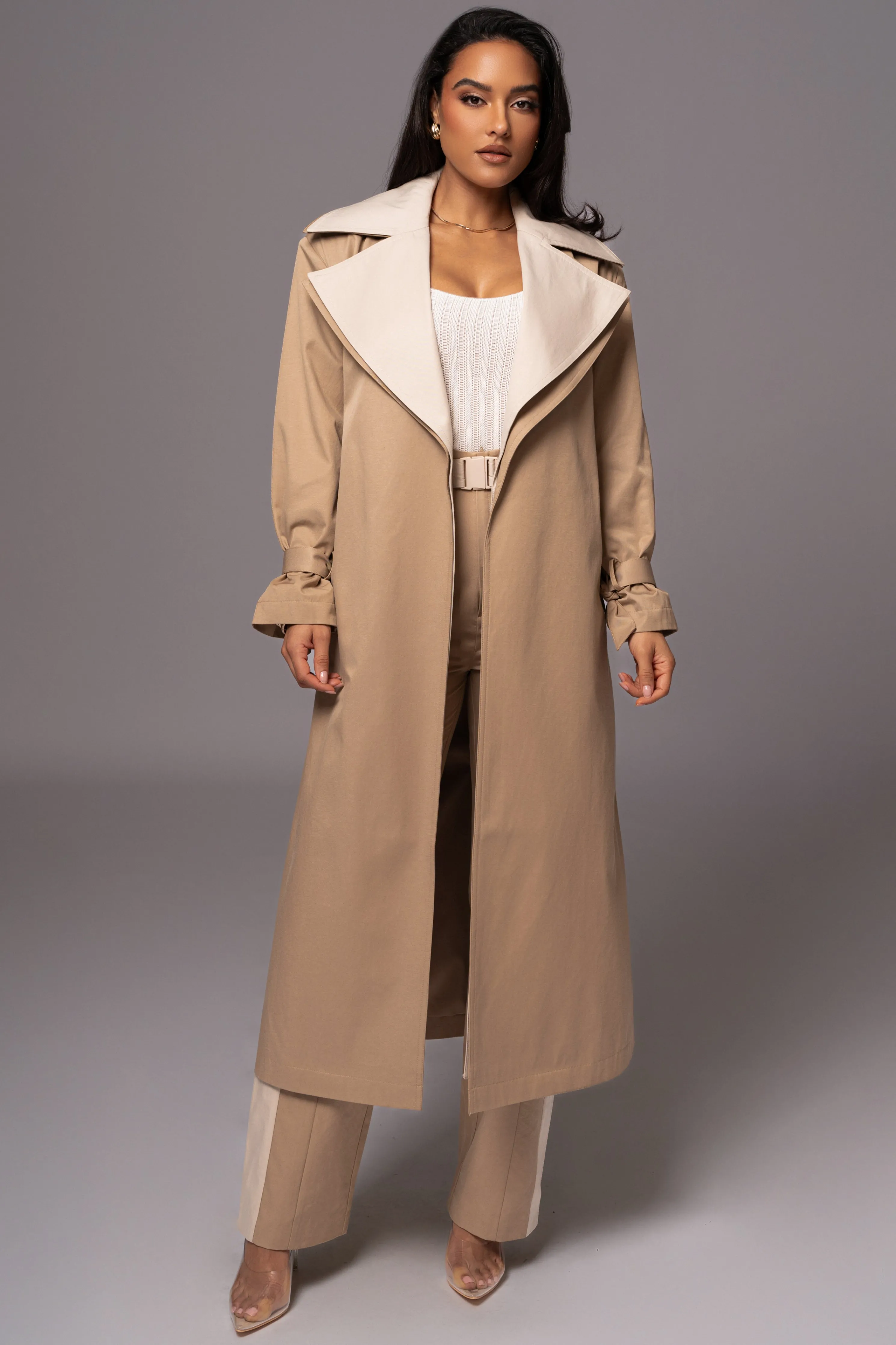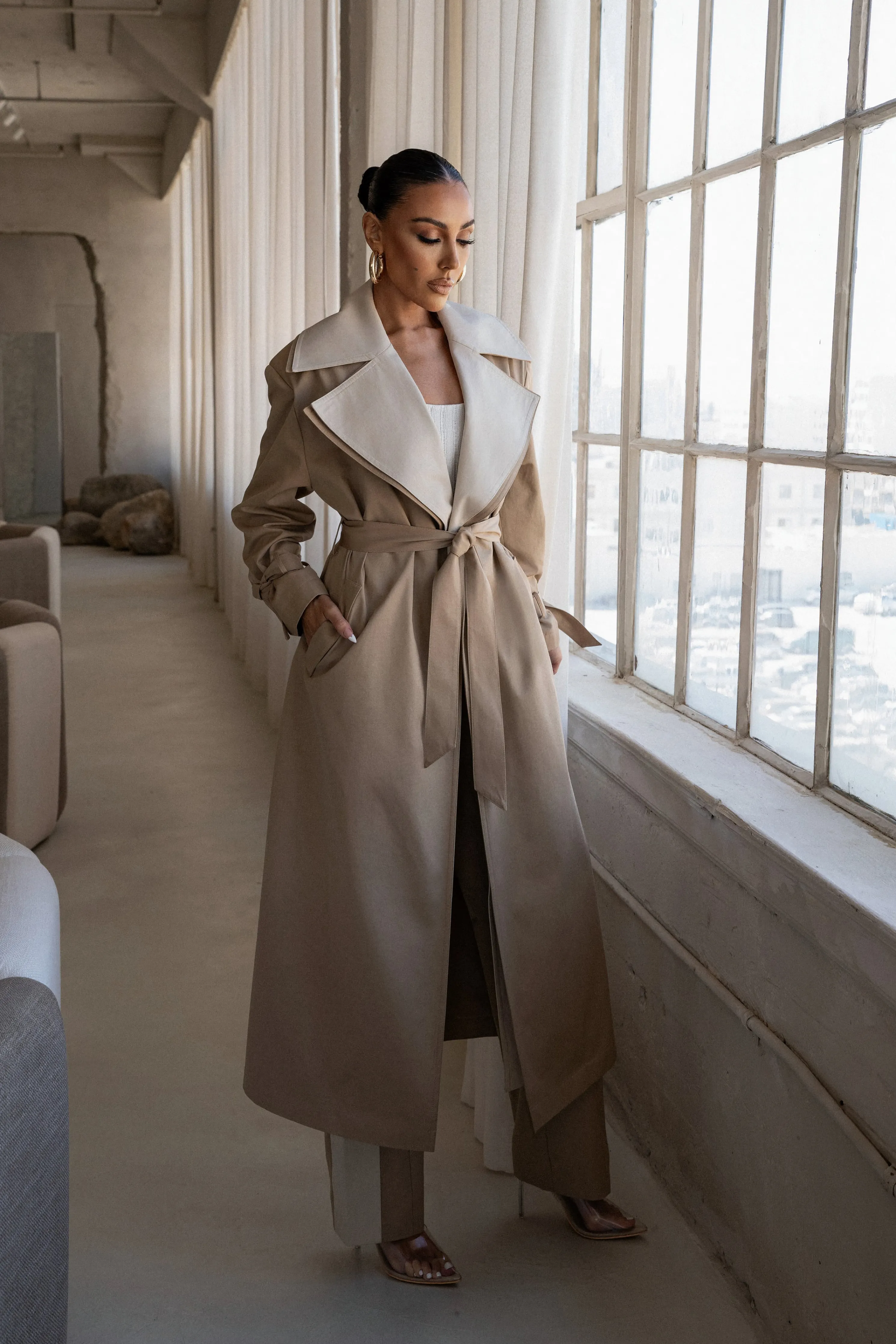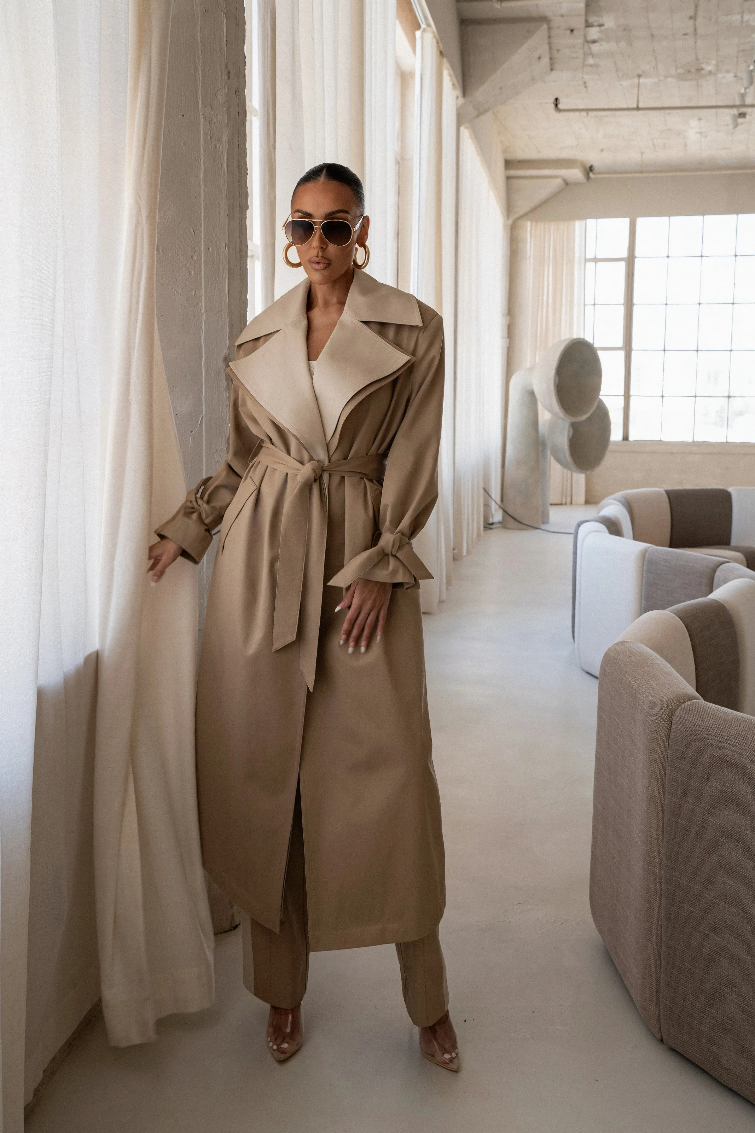 Introducing the Khaki Shona Oversized Coat, crafted for unparalleled elegance. This statement piece showcases classic notch lapels, a matching tie belt, self-tie cuff sleeves, and functional side pockets. Its contrasting design exudes sophistication, ensuring both versatility and functionality. Back slit hem. Double lined. No stretch.