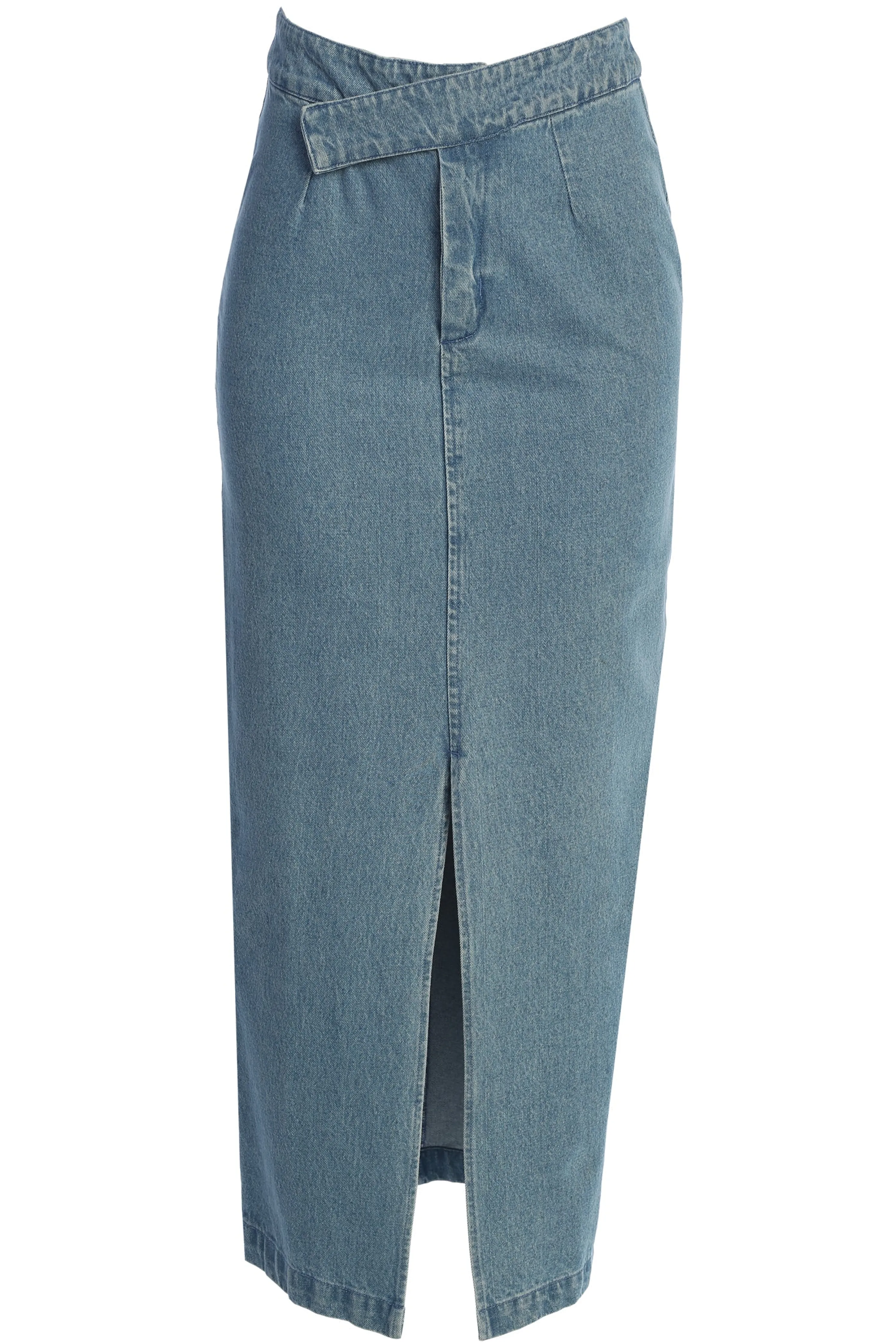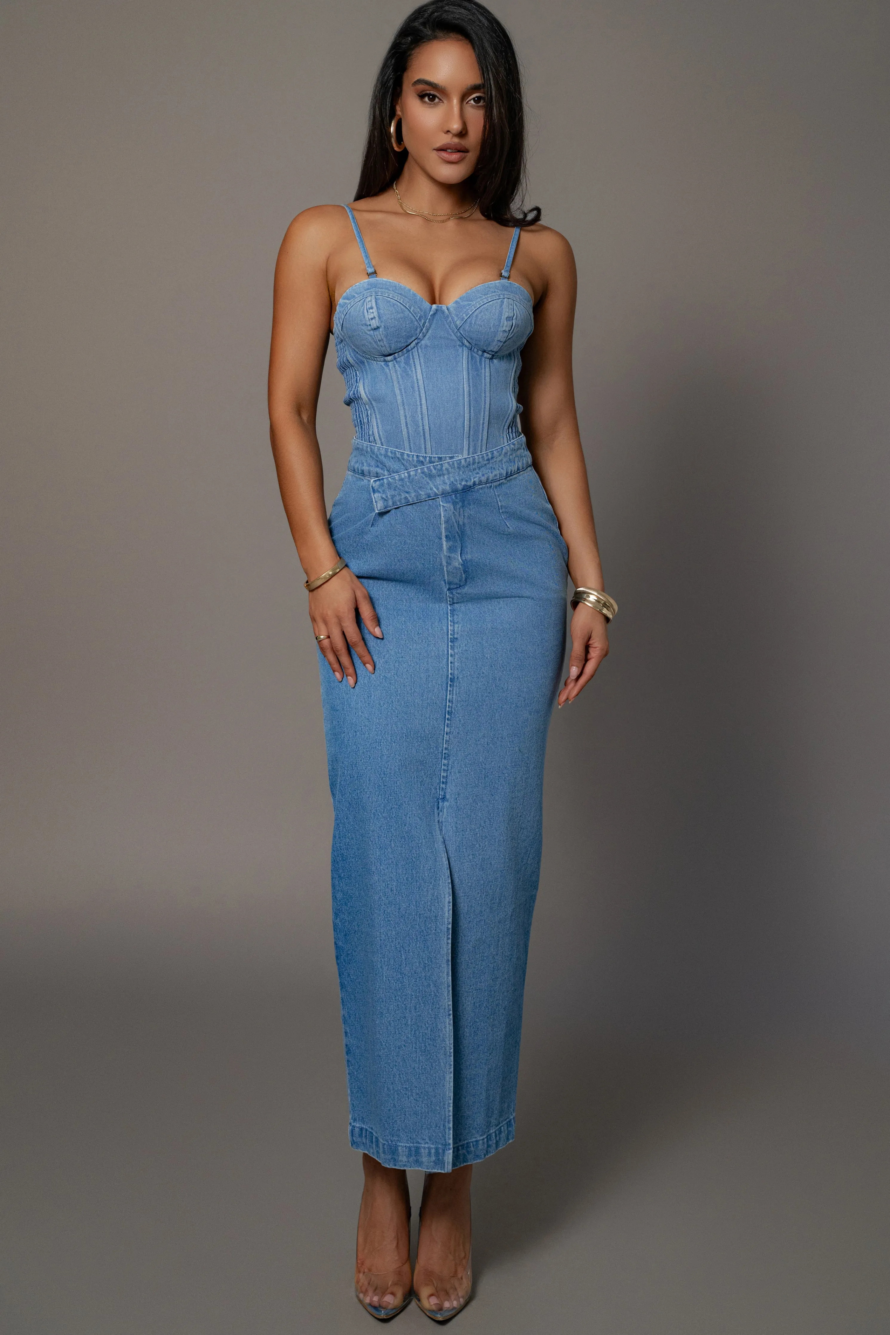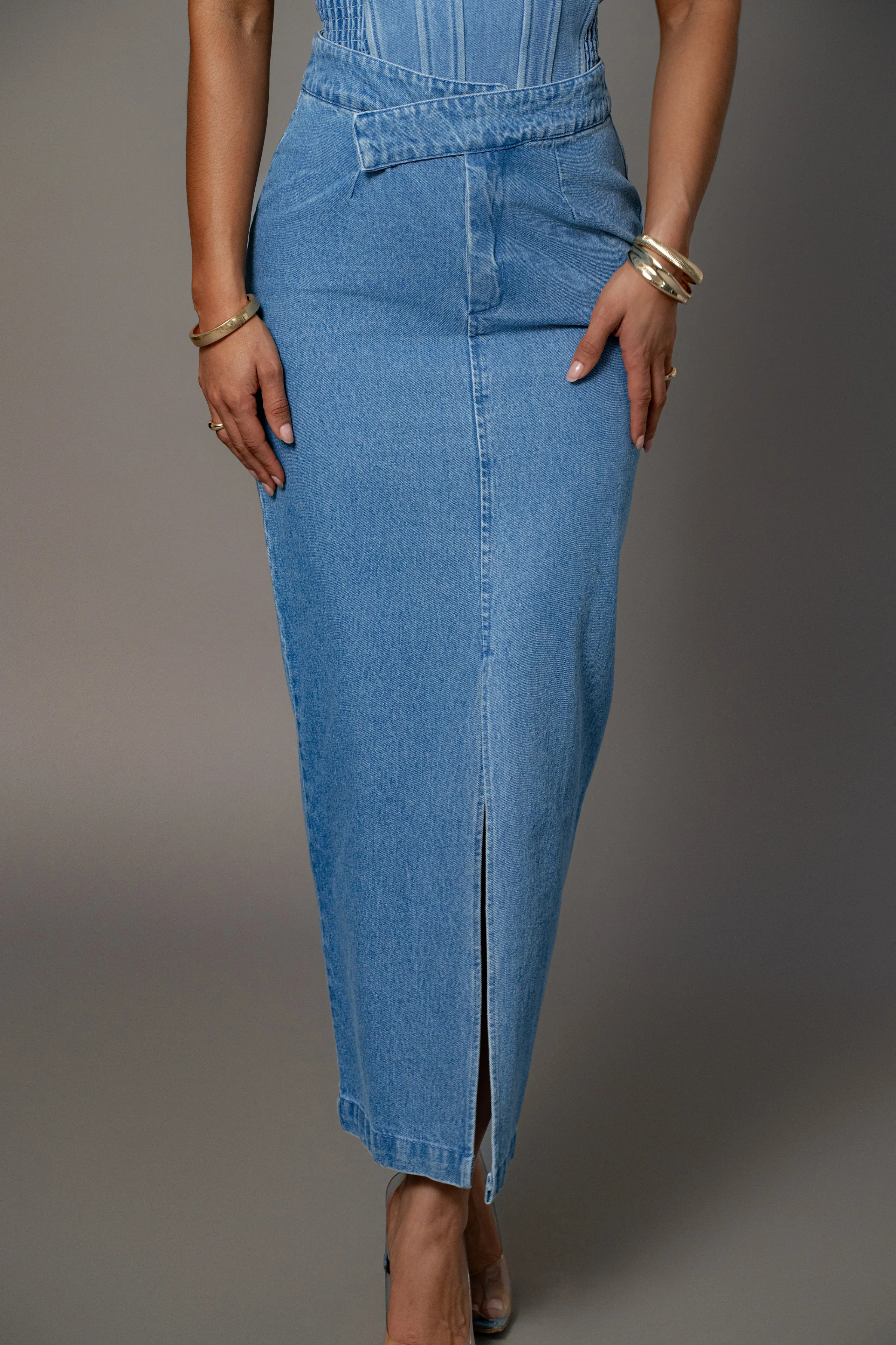 Elevate your new season style with our Medium Wash Adana Denim Skirt. Reimagined in premium denim, this luxurious piece boasts an asymmetrical waist with hook and bar zipper closure, a center slit, and back welt pockets. Pair with our Marsella Sweetheart Corset for the full look. No stretch.
