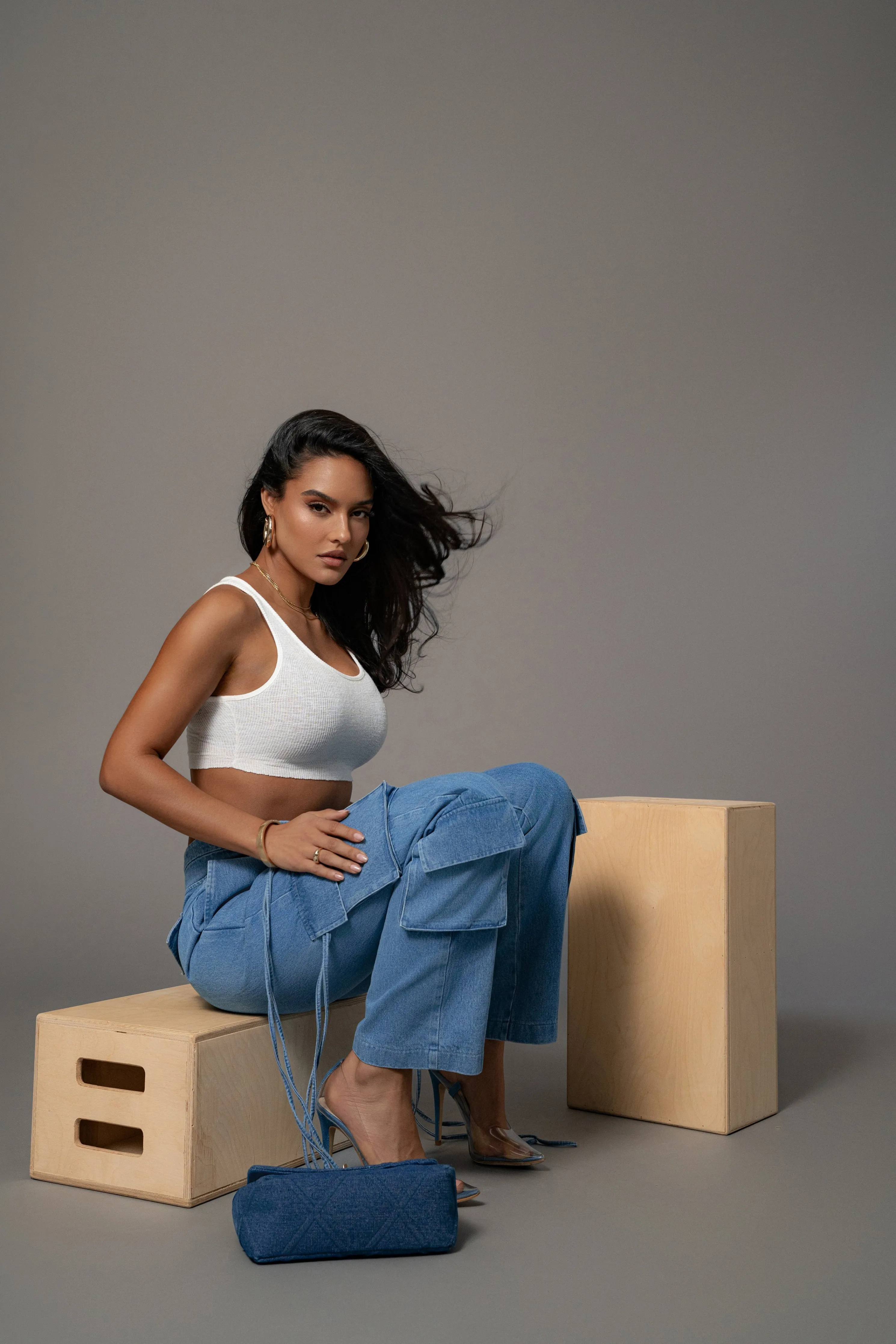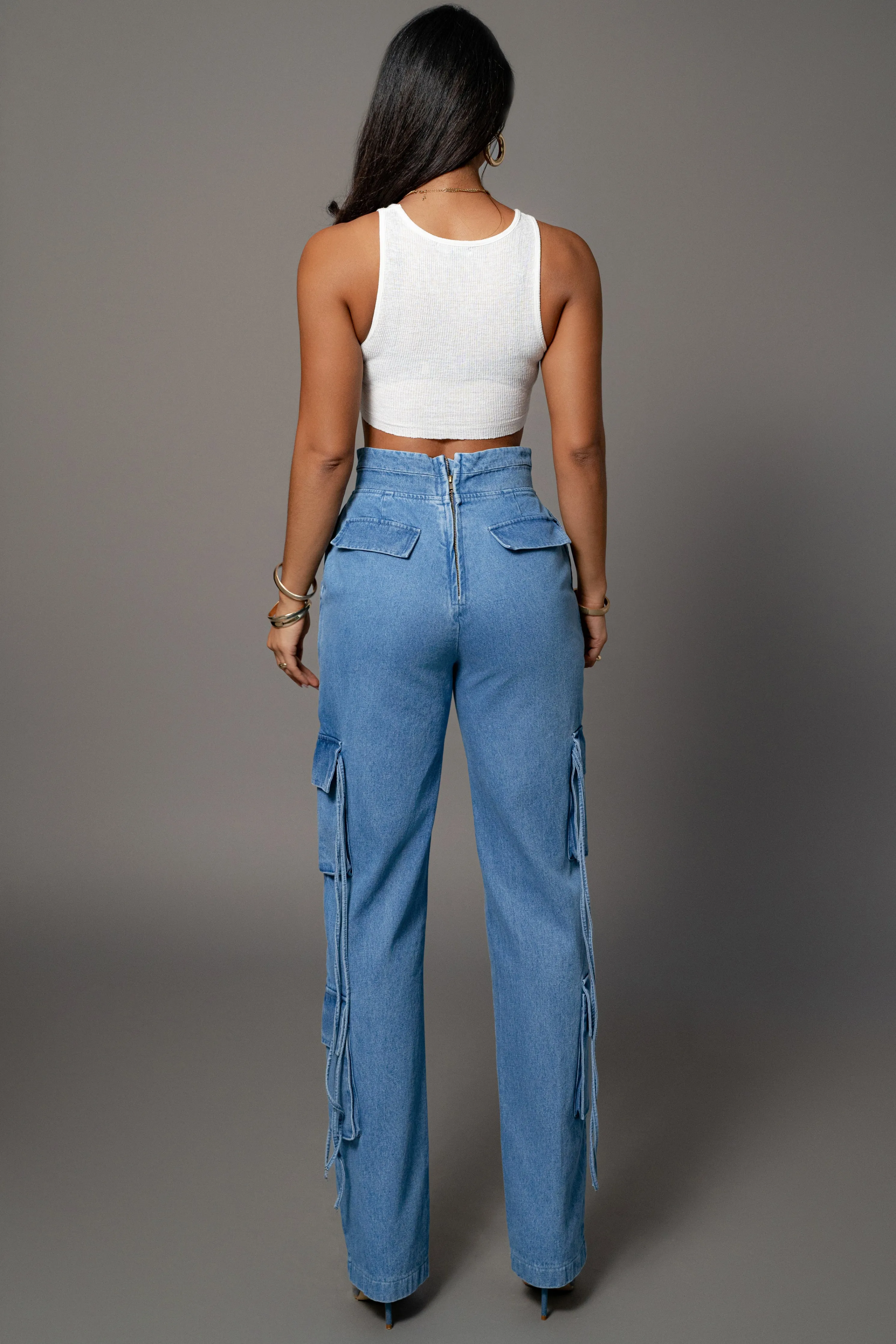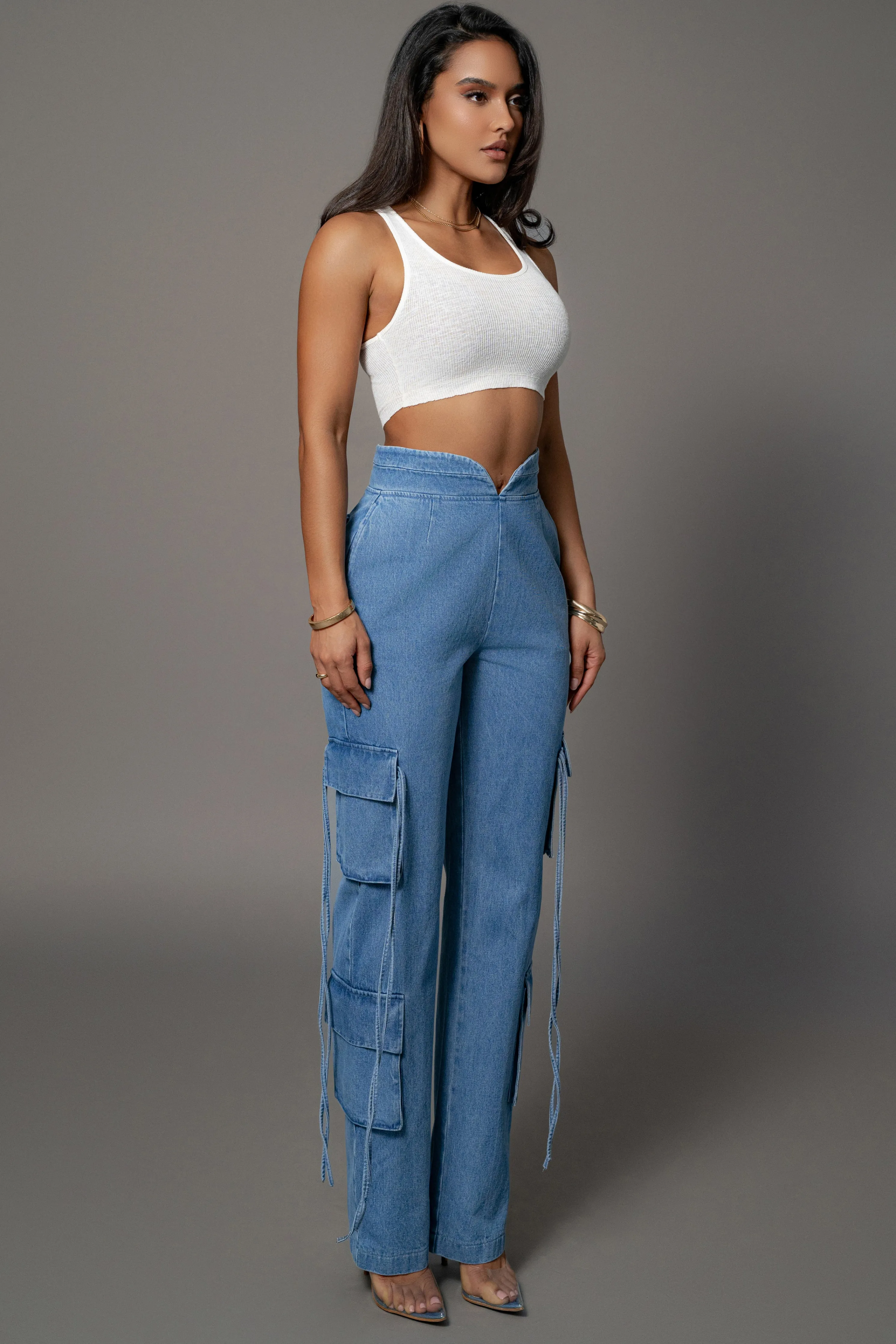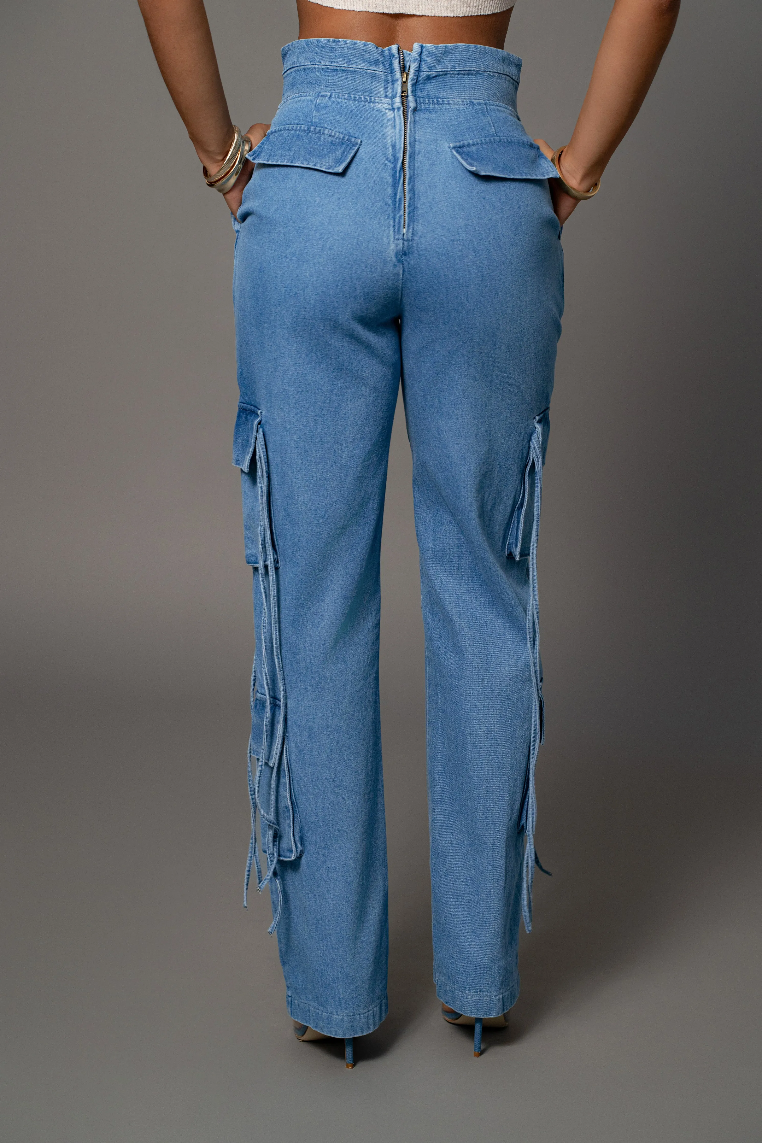 Enhance your wardrobe with a modern twist courtesy of our Medium Wash Jacinda Denim Utility Pants. Our most loved bottoms have been redesigned in denim adding a classic touch to your wardrobe. Crafted from premium denim fabric, these unique bottoms feature a front slit at the waistband and stylish cargo pockets adorned with drawstring ties for extra flair. Back faux flap pockets and zipper closure. No stretch.