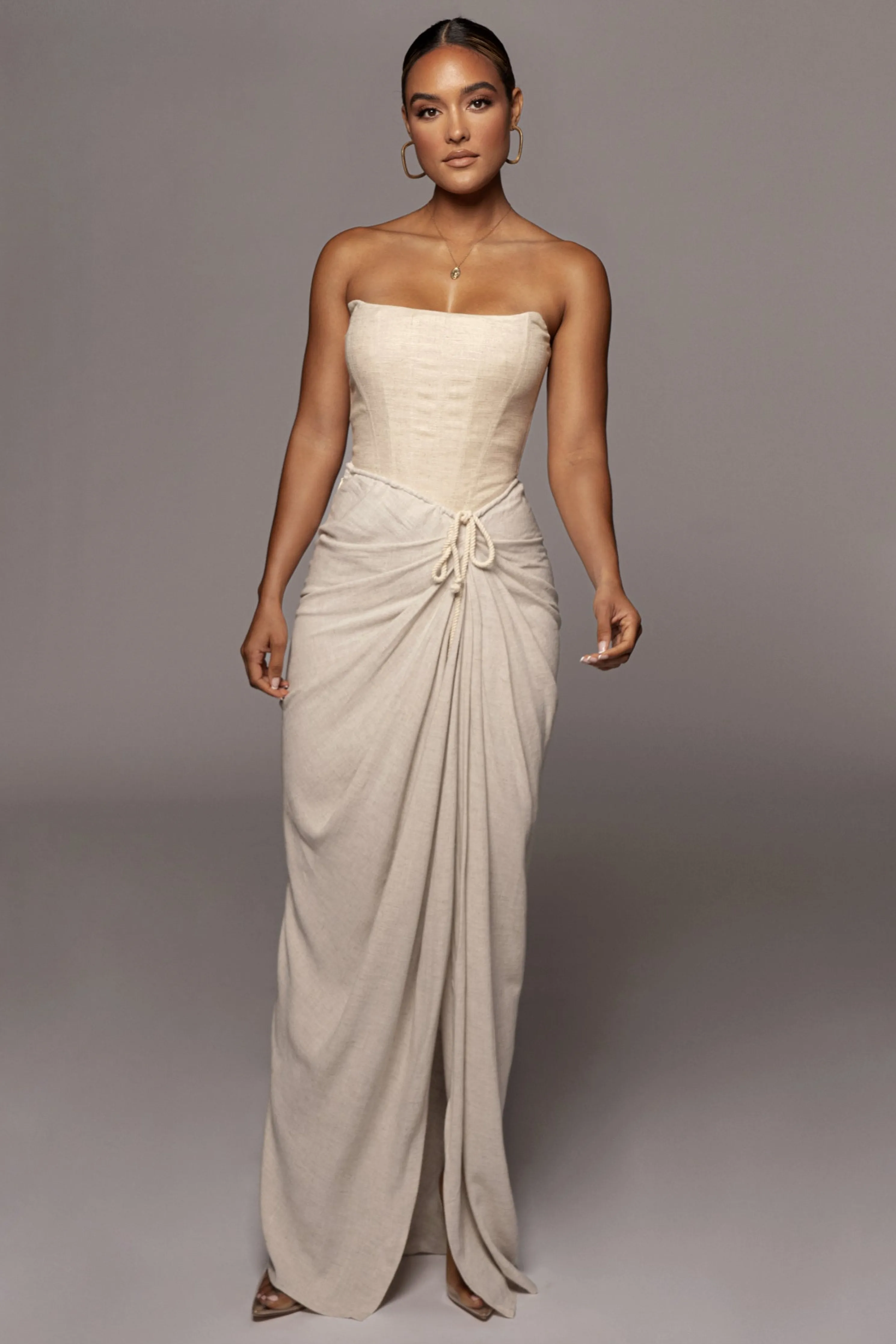 Draped to perfection proving life’s better in linen with our Natural Noelia Linen Slit Skirt. Crafted in a fresh linen material, this maxi skirt featuresa drape design with a stylish rope drawstringand a slit on the side. Hidden side zipper for closure. Pair with our FENIX LINEN CORSET for a full look. No stretch. Single lined.
