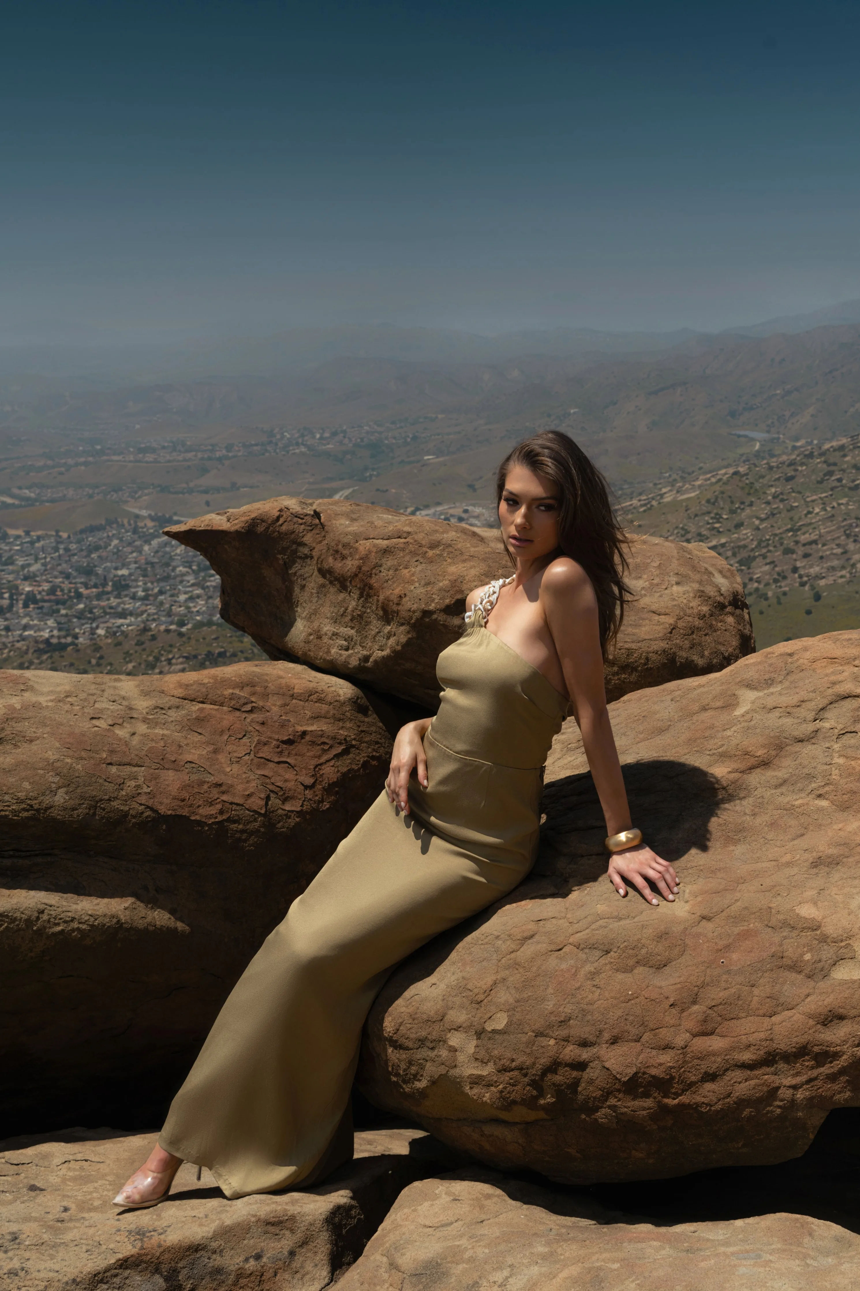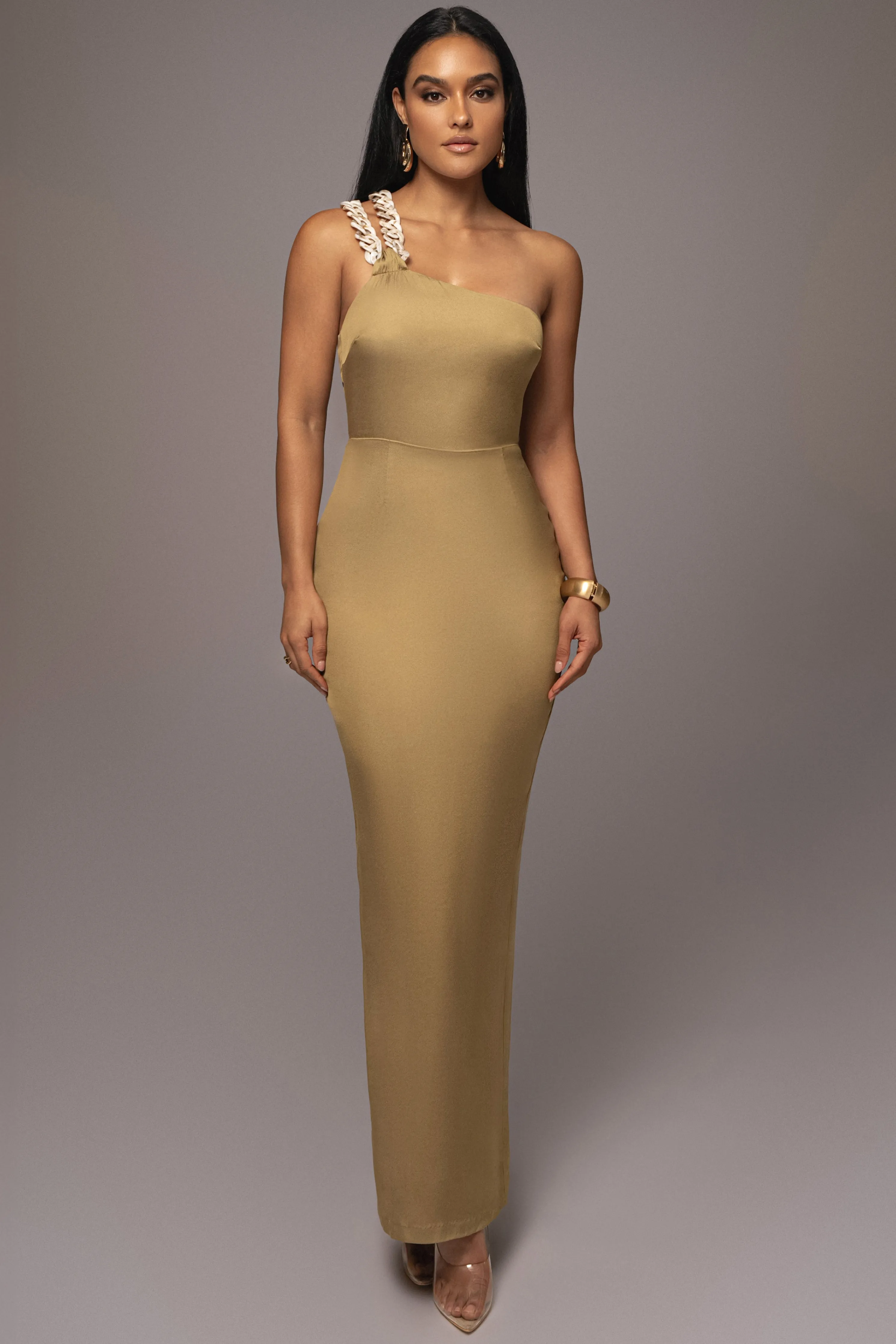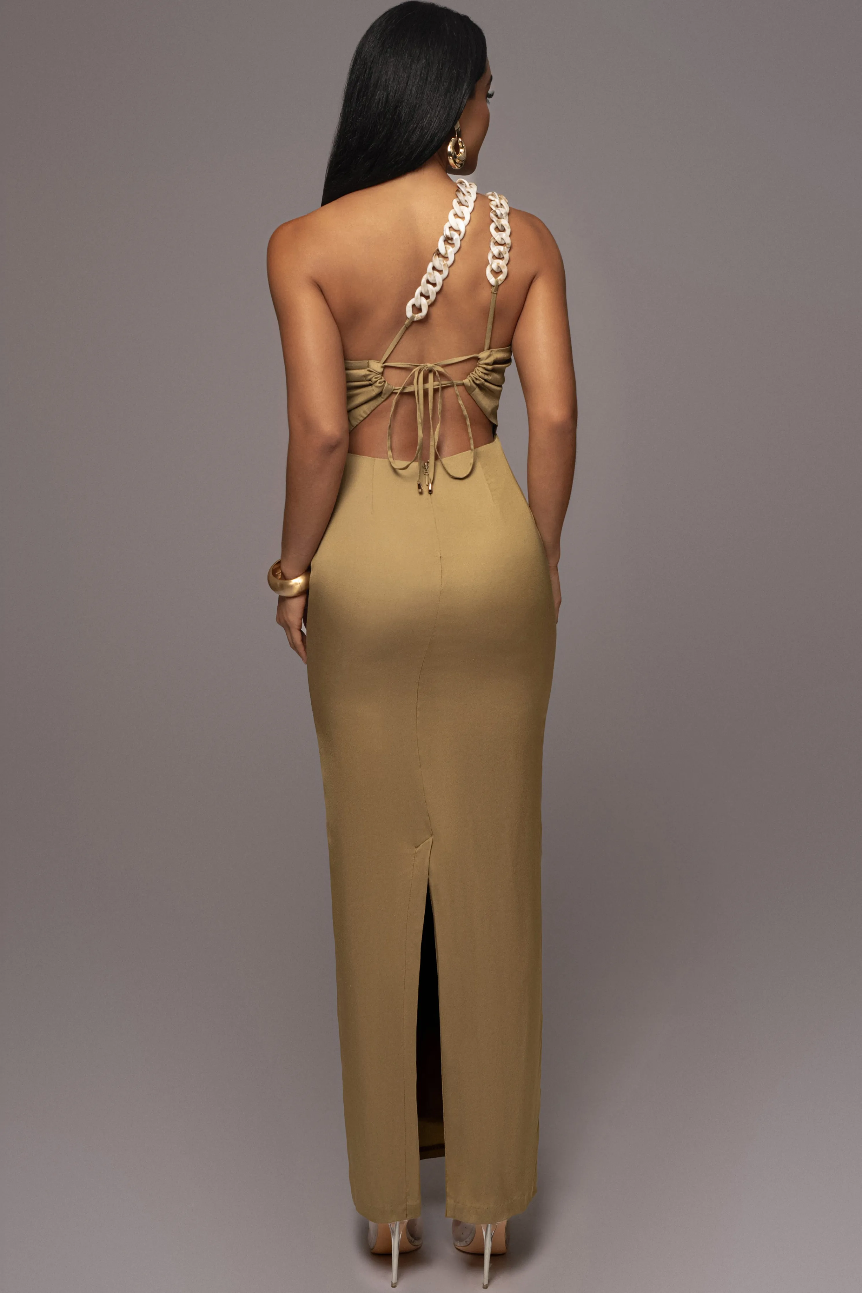Step into summer elegance with our Olive Luxury Living Maxi Dress. This event-ready dress showcases a one-shoulder design with elegant acrylic chain straps and stylish back ties. Complete with a hidden back zipper closure and a back-slit hem. Medium stretch. Lined interior.