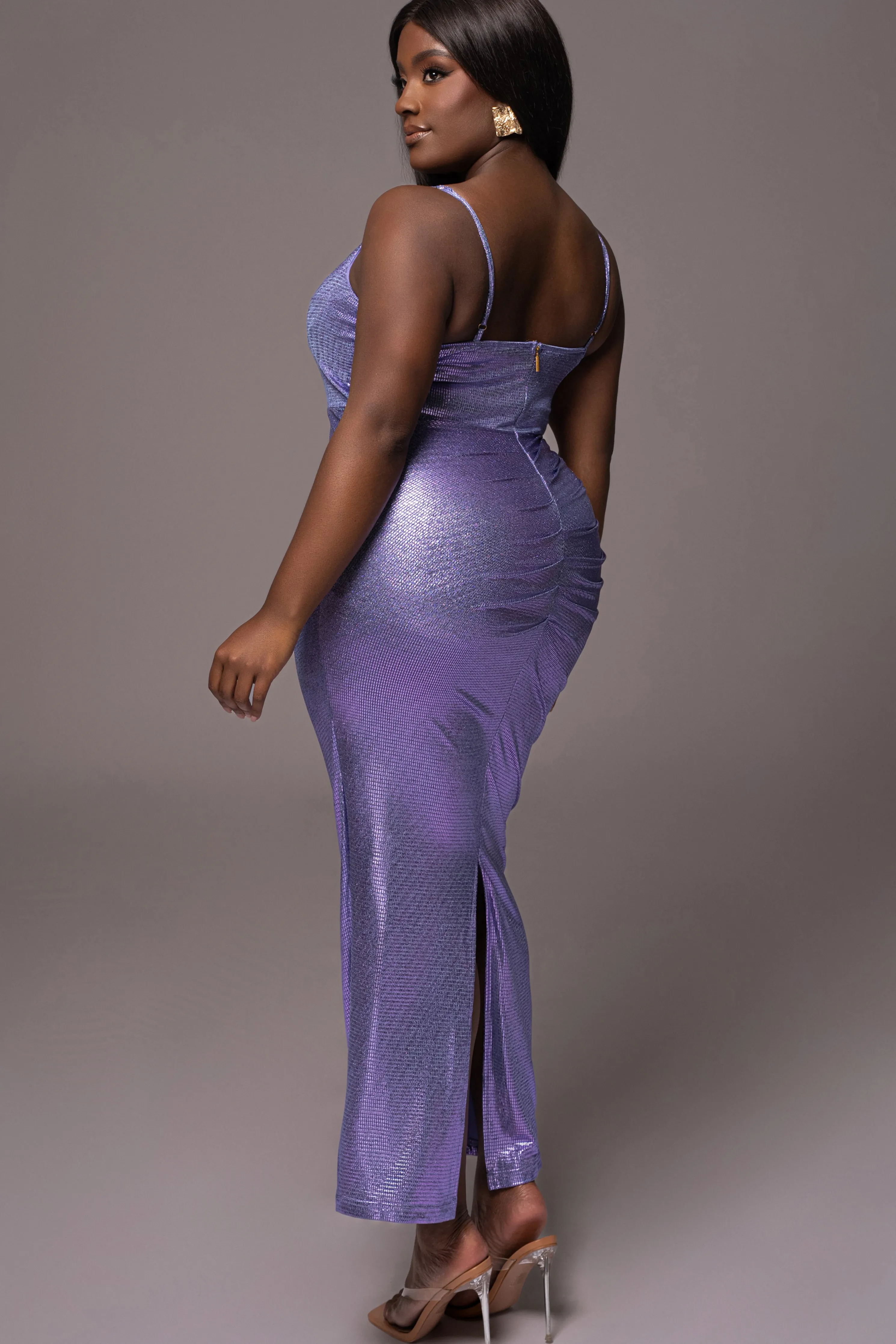 Have a luxe moment all night long with ourPurple Rubi Cowl Neck Cocktail Dress. This one of a kind maxi dress features an elegant cowl neck with adjustable camisole straps, slit ruching throughout, and a low center slit at the back. Crafted in a mix of shiny and scaly fabric for a shimmering visual. Back zipper for closure. Stretchy.