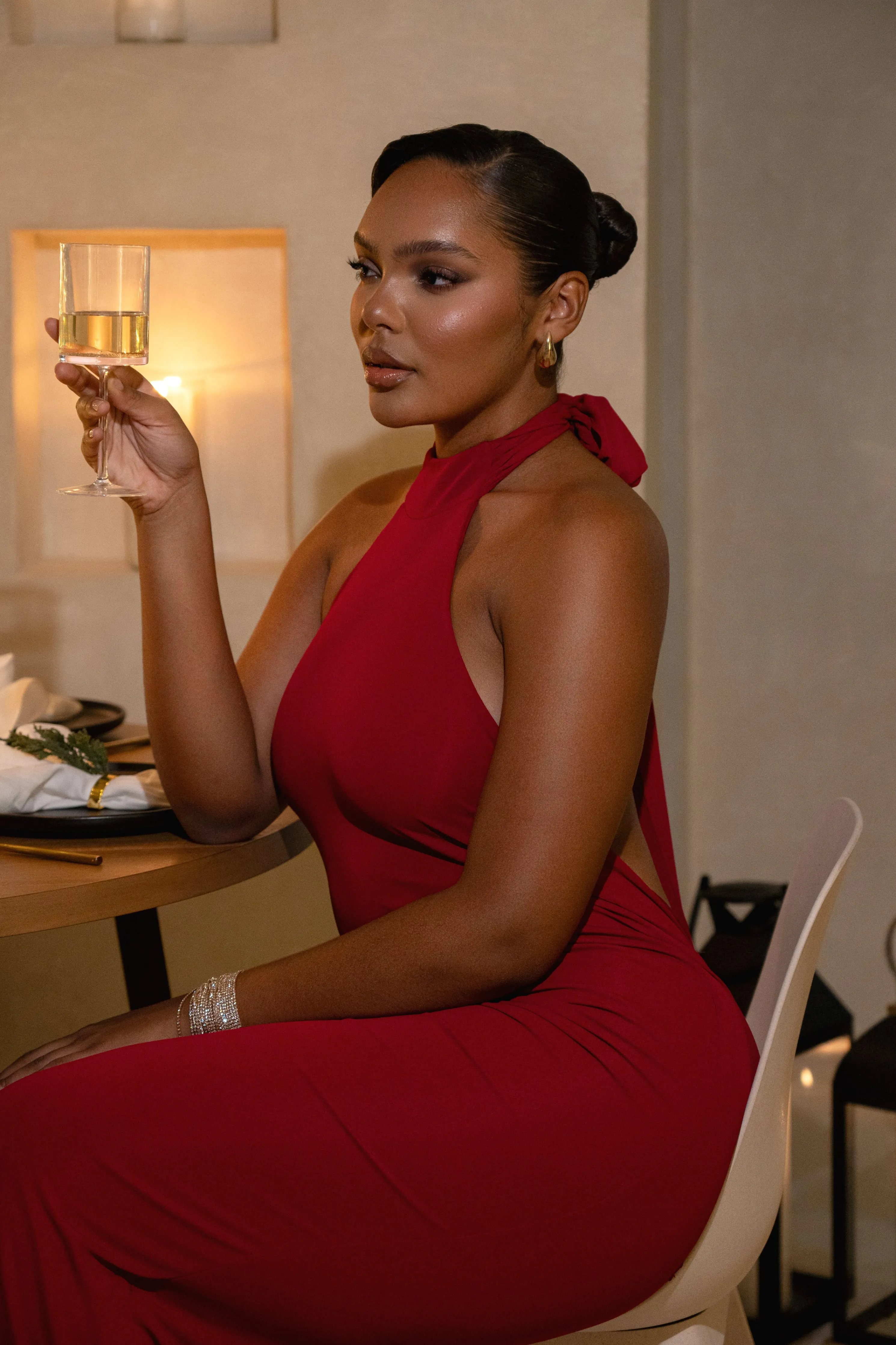 Be a vision of elegance in our Red Golden Evening Maxi Gown. This stunning piece features long neck ties that cascade beautifully down your back and a bold backless design that adds the perfect finishing touch. The fitted silhouette effortlessly transitions into a captivating mermaid hem.Double lined. Stretch.