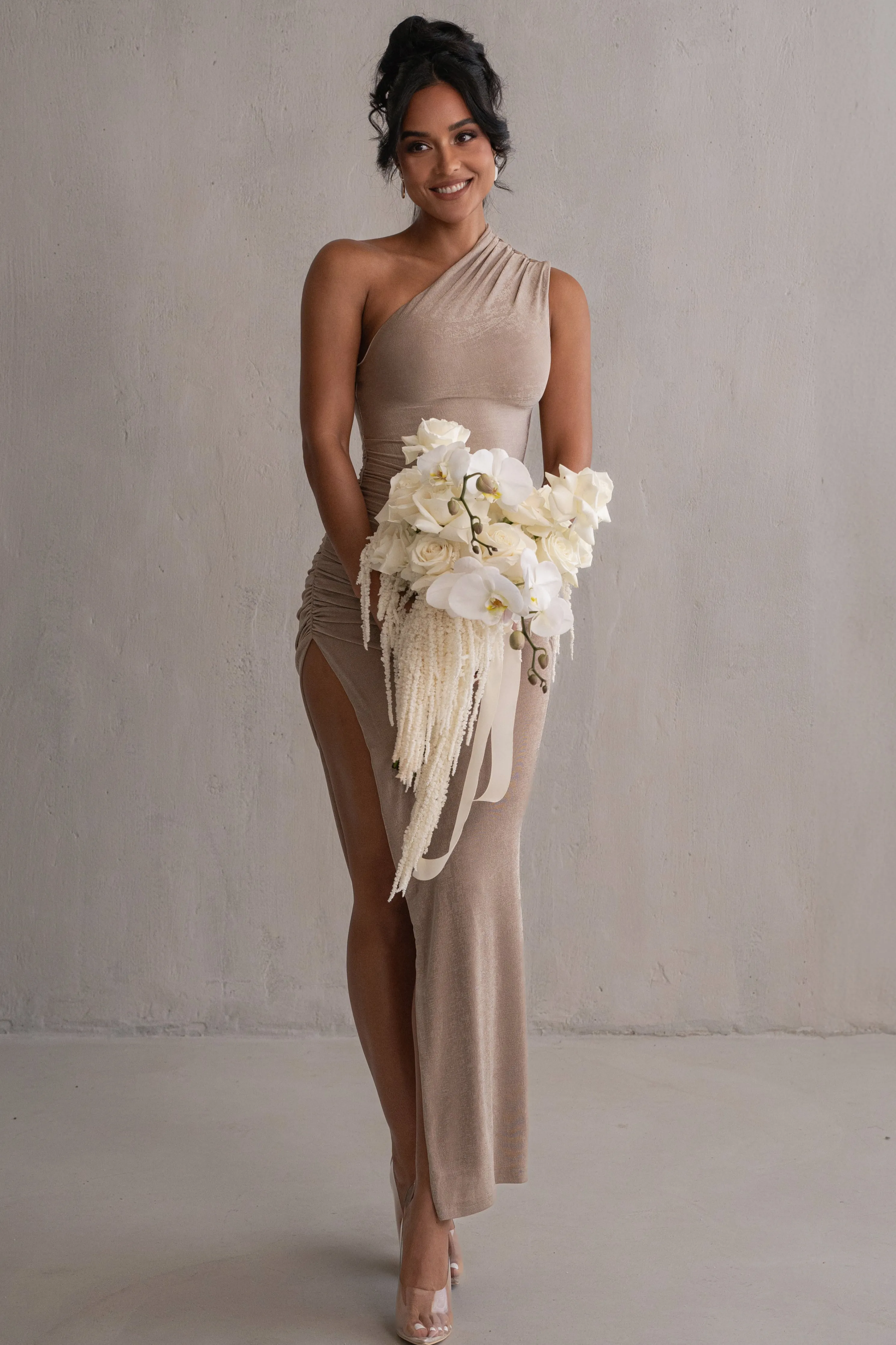 Designed for the JLUXLABEL Bridal Collection. Our Taupe Eden One Shoulder Maxi Dress serves timeless glamour. Featuring a one-shoulder neckline in a fitted silhouette with slight ruching at the shoulder and waist. A slide slit adds extra charm. Constructed in a stretchy slinky fabric offering a flexible fit. Double lined.