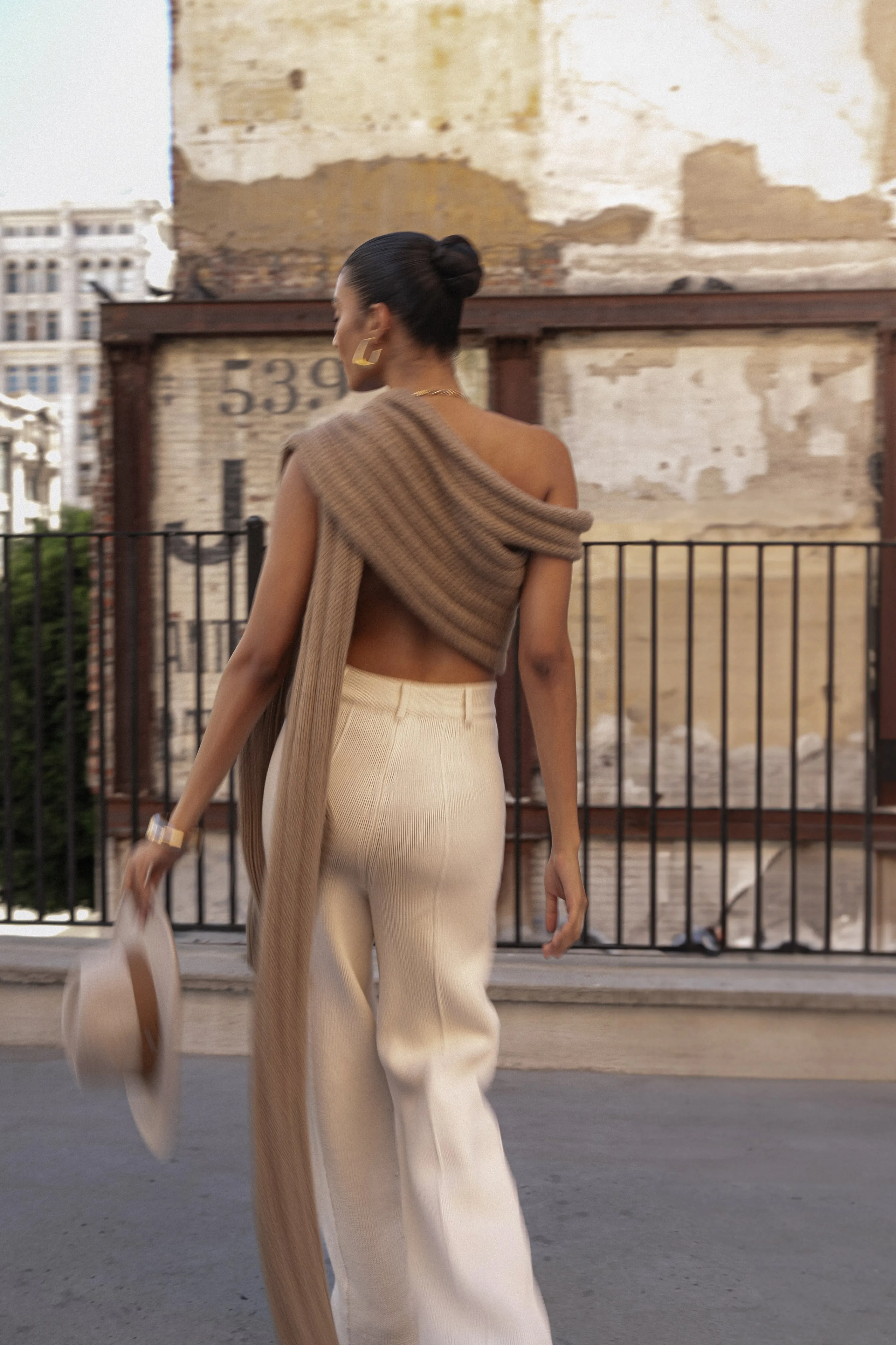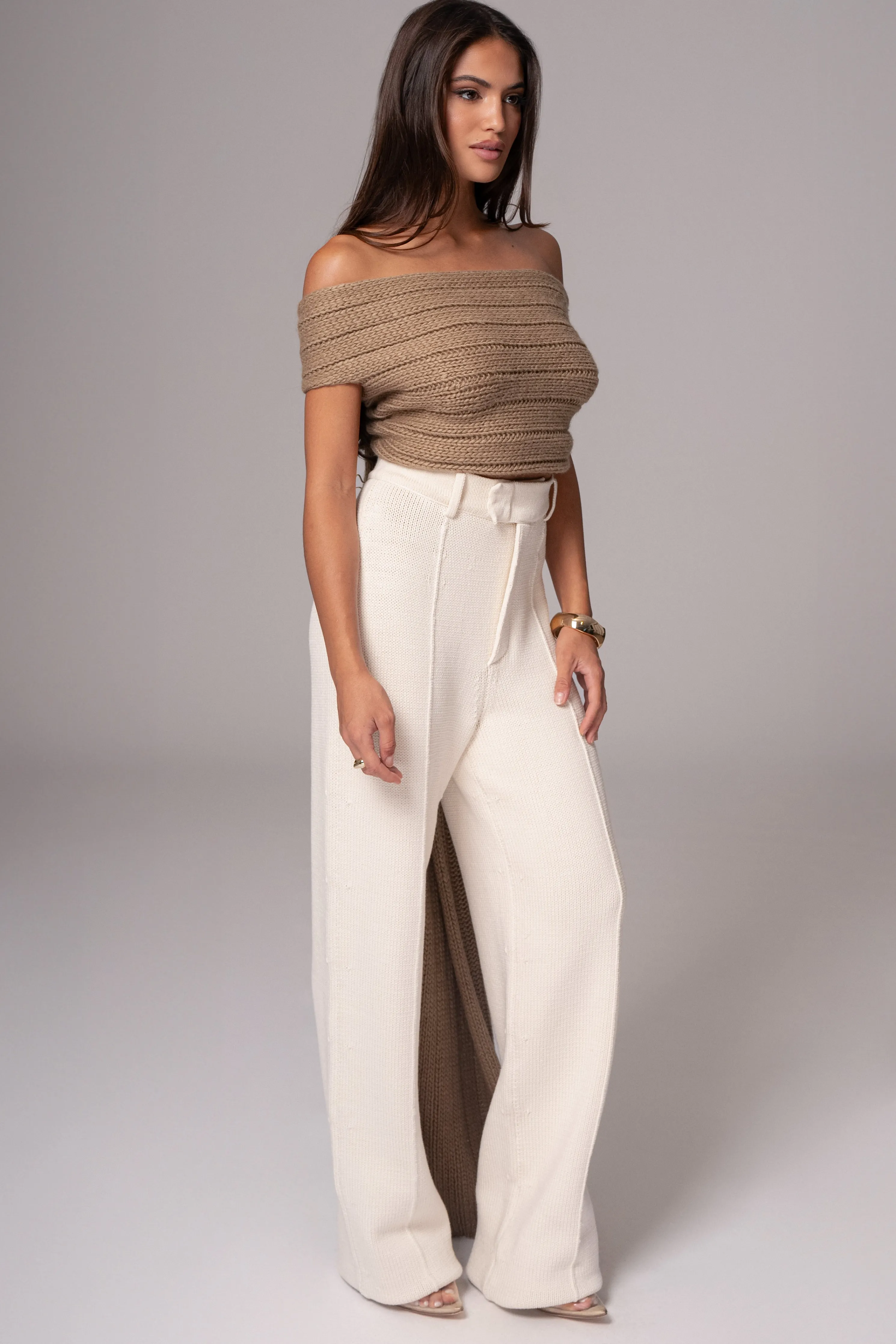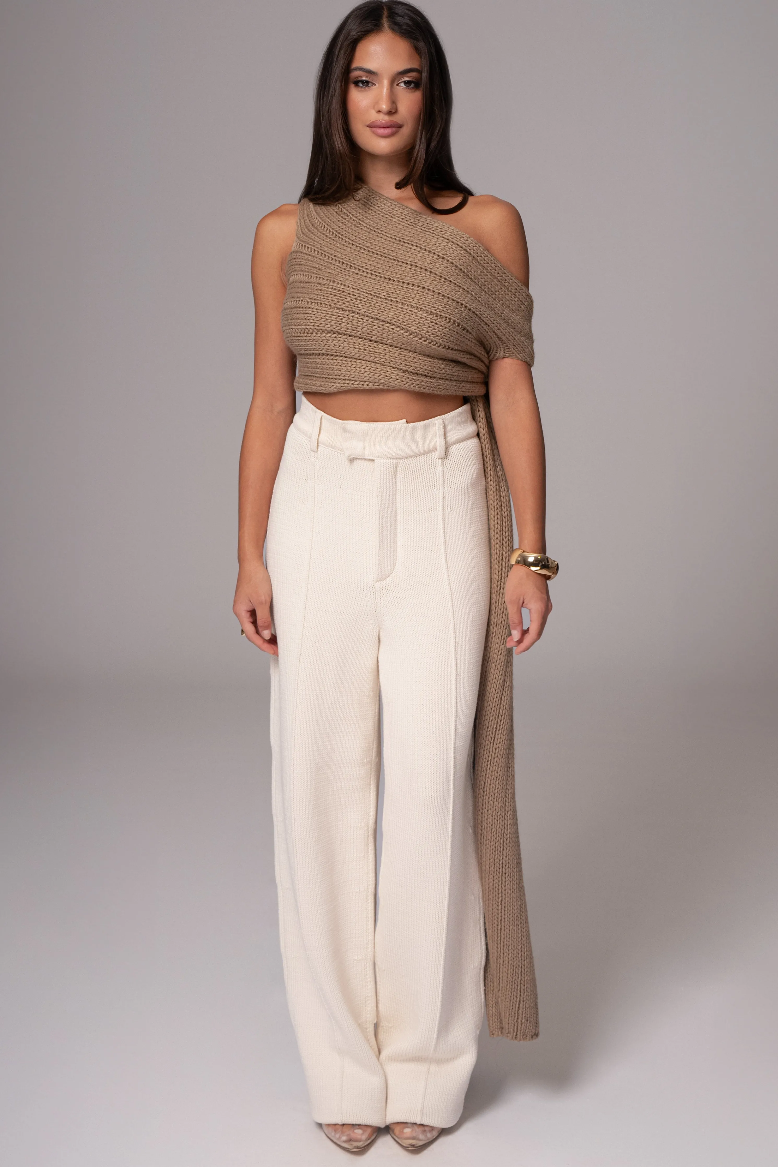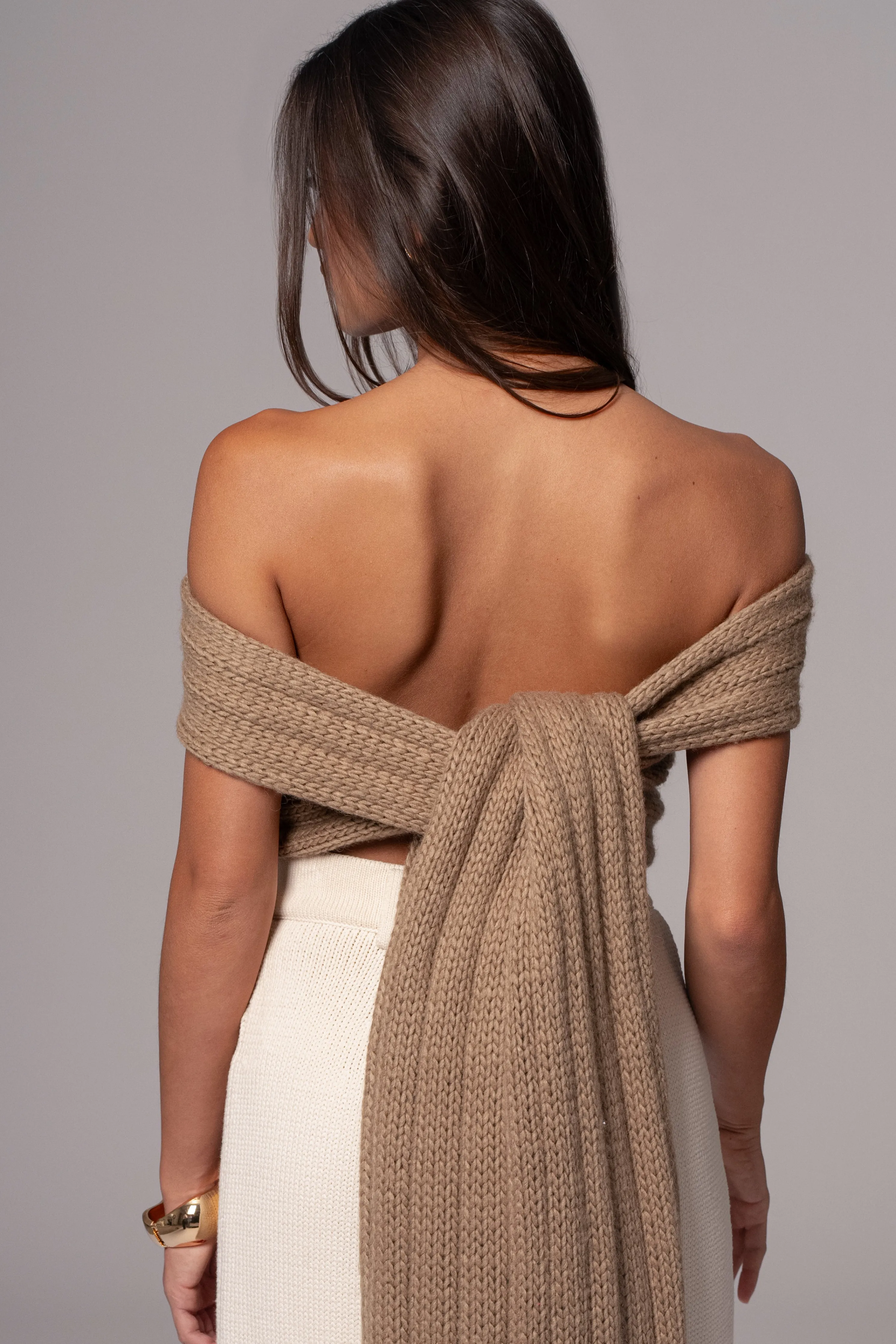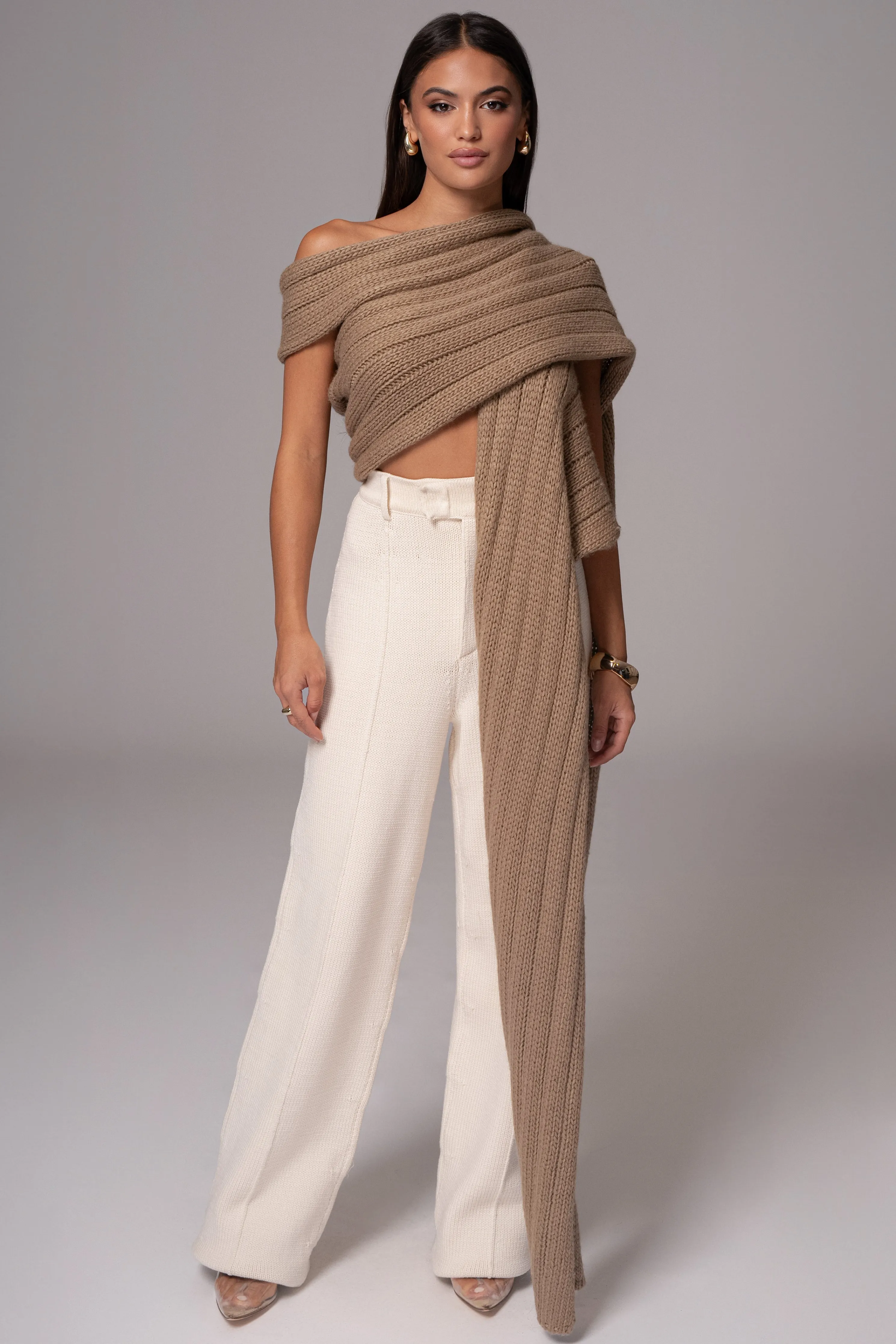 Enhance your Fall wardrobe with our Taupe Soft Life Sweater Knit Cable Top, designed for limitless styling options. Crafted from a soft cable knit fabric, this versatile wrap top allows for multiple styling variations, including a scarf-inspired neckline that elegantly drapes across the front. Pair with our Back In Business Knit Trousers for the full look. Single lined. Stretchy.