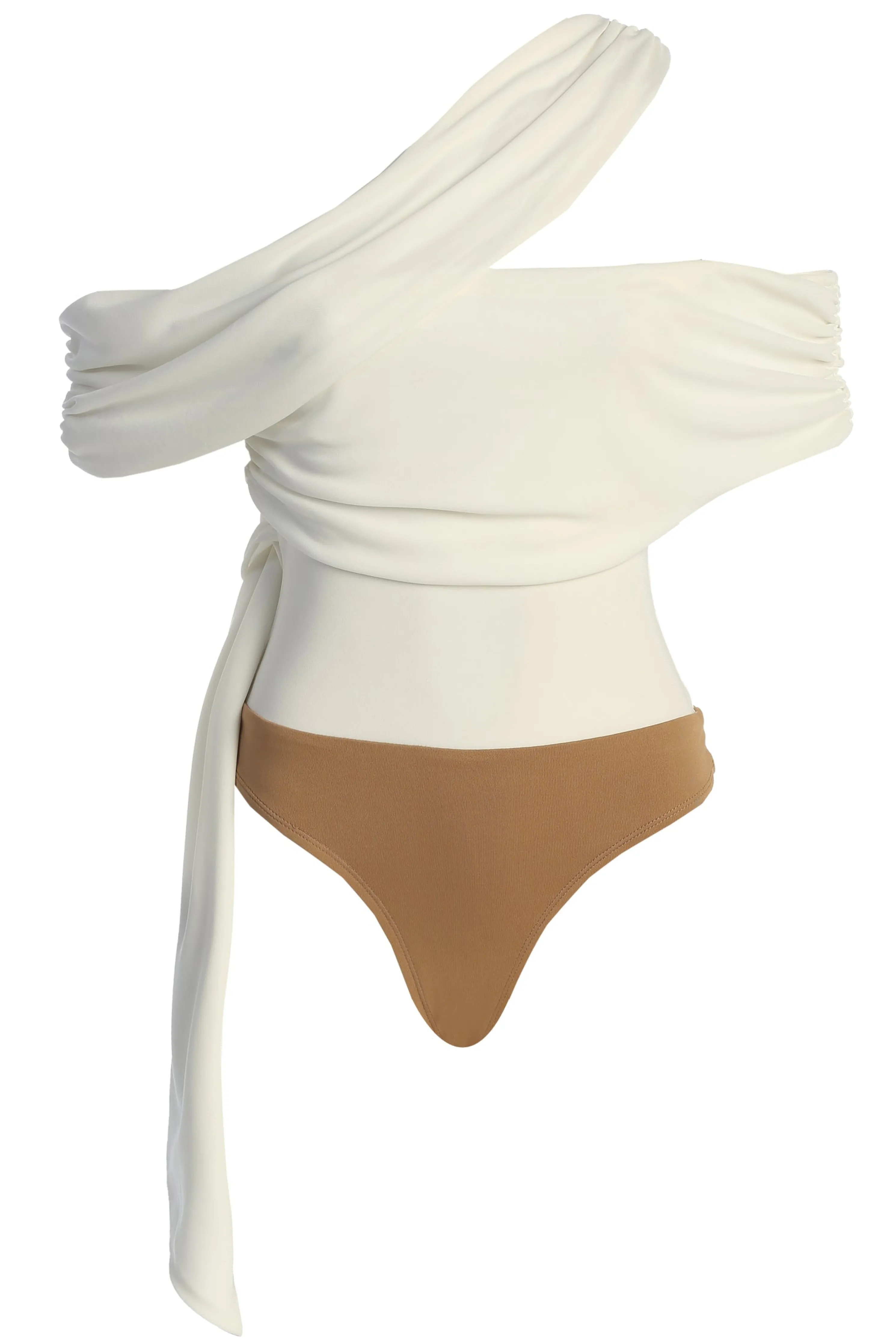 A timeless piece that speaks for itself, ourWhite Above All Drape Bodysuit is the staple you’ll wear on repeat all year. Featuring a stunning draped design with asymmetric neckline, the lower waist of this elegant bodysuit is composed of a smooth doubled-lined nude fabric for extra comfort with snap closures. Pair with our Asymmetrical Draped Trousers for the full look. Some stretch.