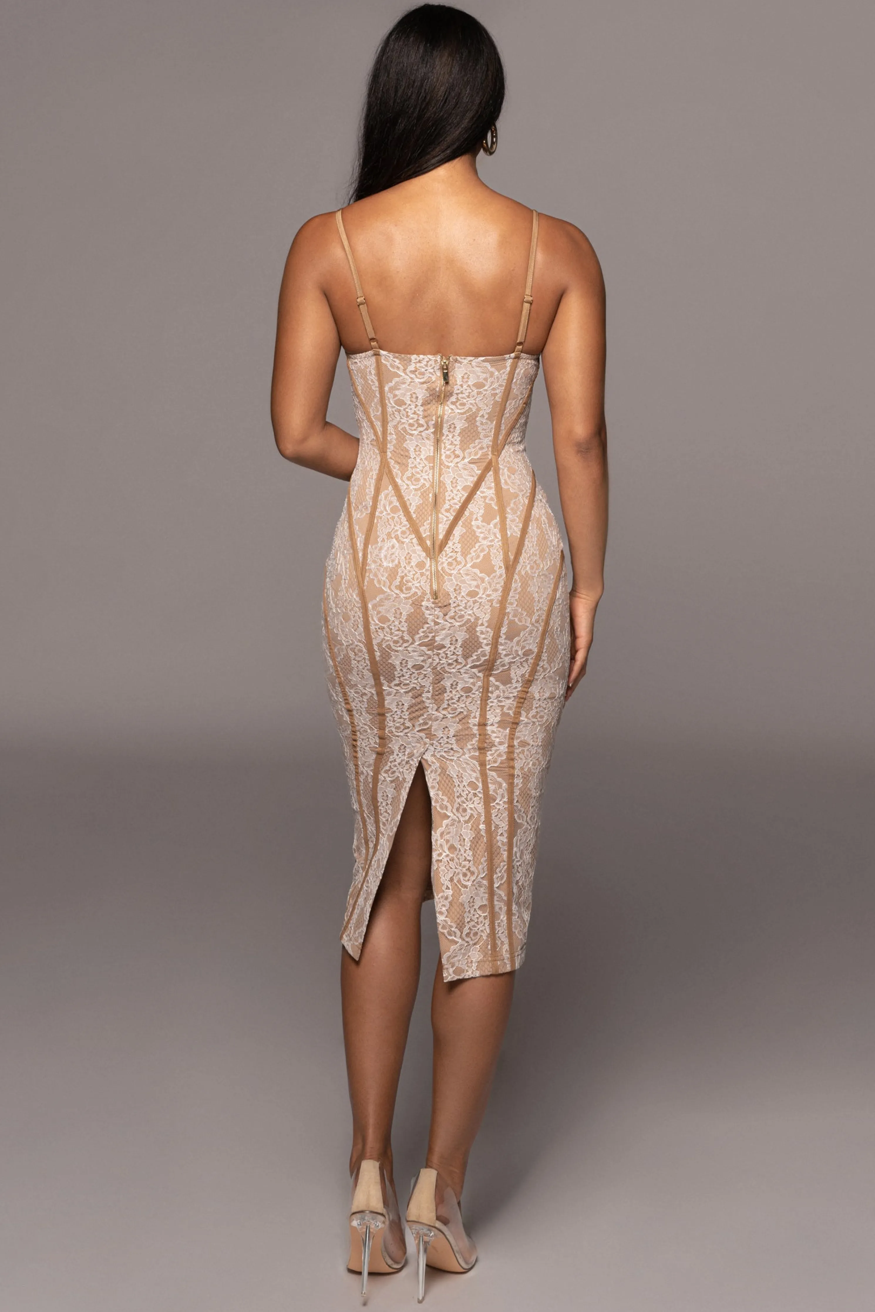 Lovely in lace with ourWhite Katerina Lace Dress. This gorgeous curve-hugging dress features a sweetheart neckline with a bustier style bodice, and a back slit at the lower hem. Stunning piping detail throughout elevates the glamour of this midi length dress, complete with adjustable shoulder straps and back zipper for closure. Gold tone accents. Lined interior. Some stretch.