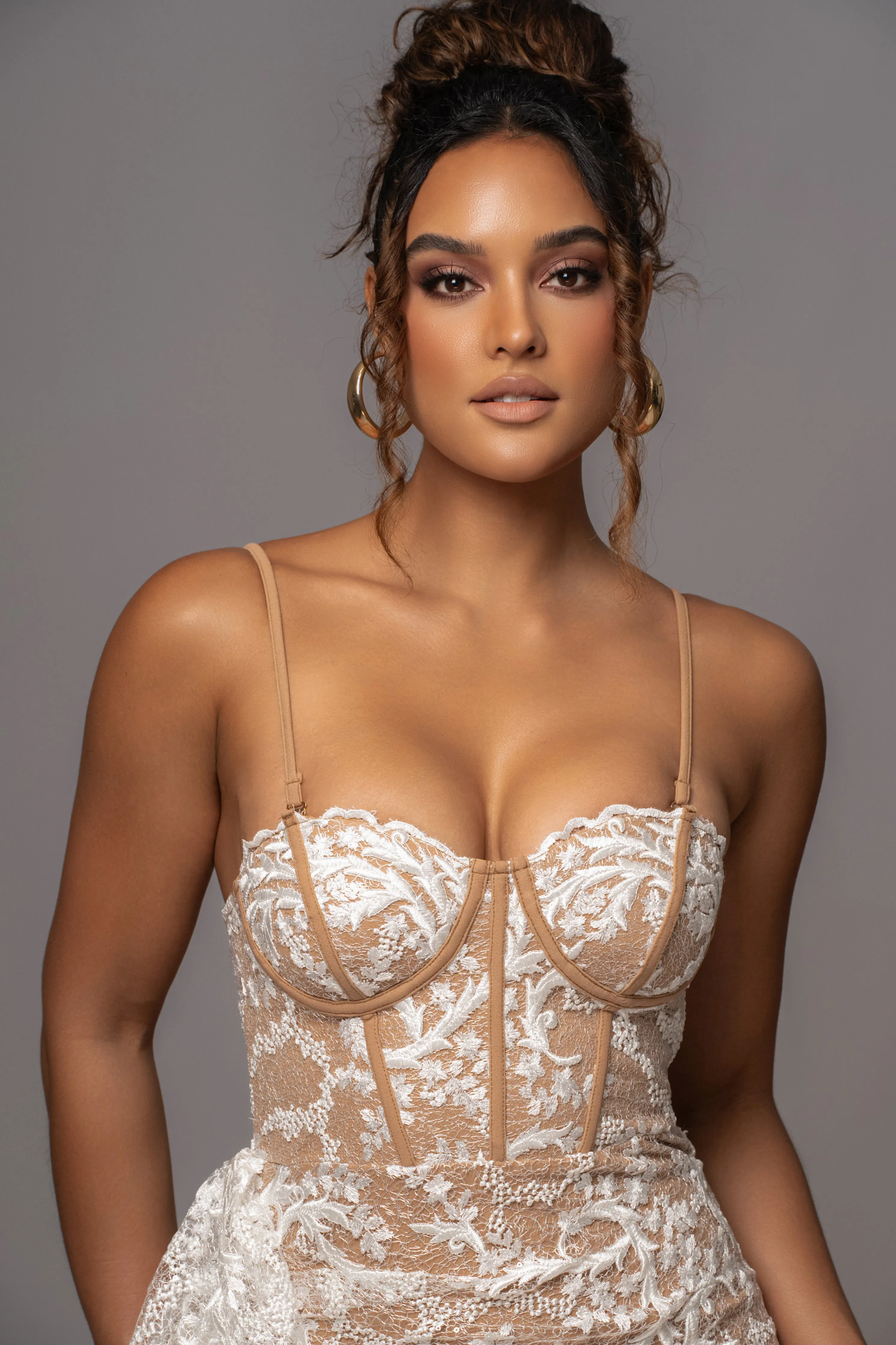 OurWhite Marilyn Lace Mini Dress features a corset-inspired design crafted from luxurious lace fabric with boning detail creating a structured silhouette with a ruffled side drape adding a feminine touch. Featuring padded cups, grip silicone at the bust for added support, and adjustable/removable shoulder straps for a versatile strapless styling option.Hidden side zipper closure. Double lined. No Stretch.