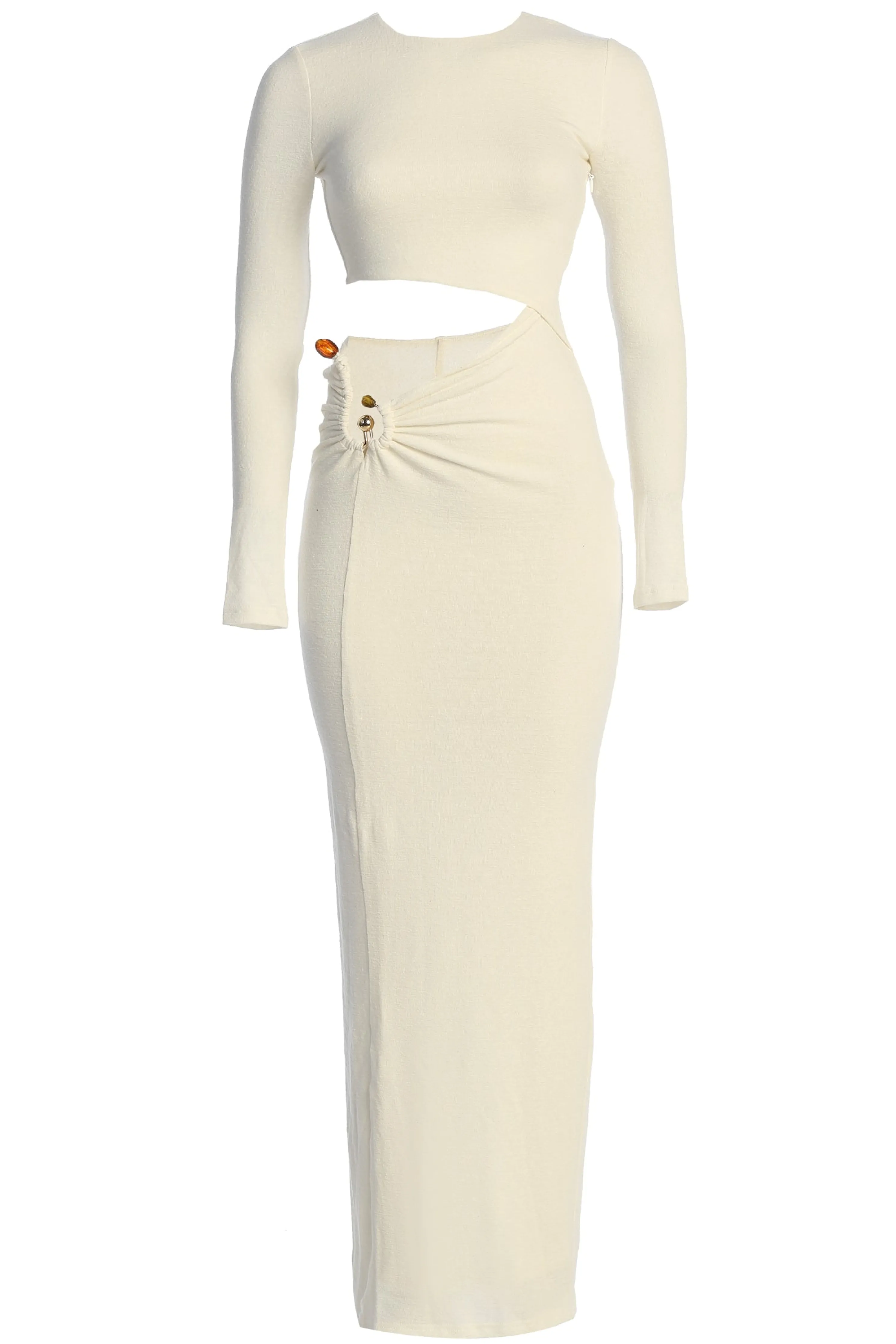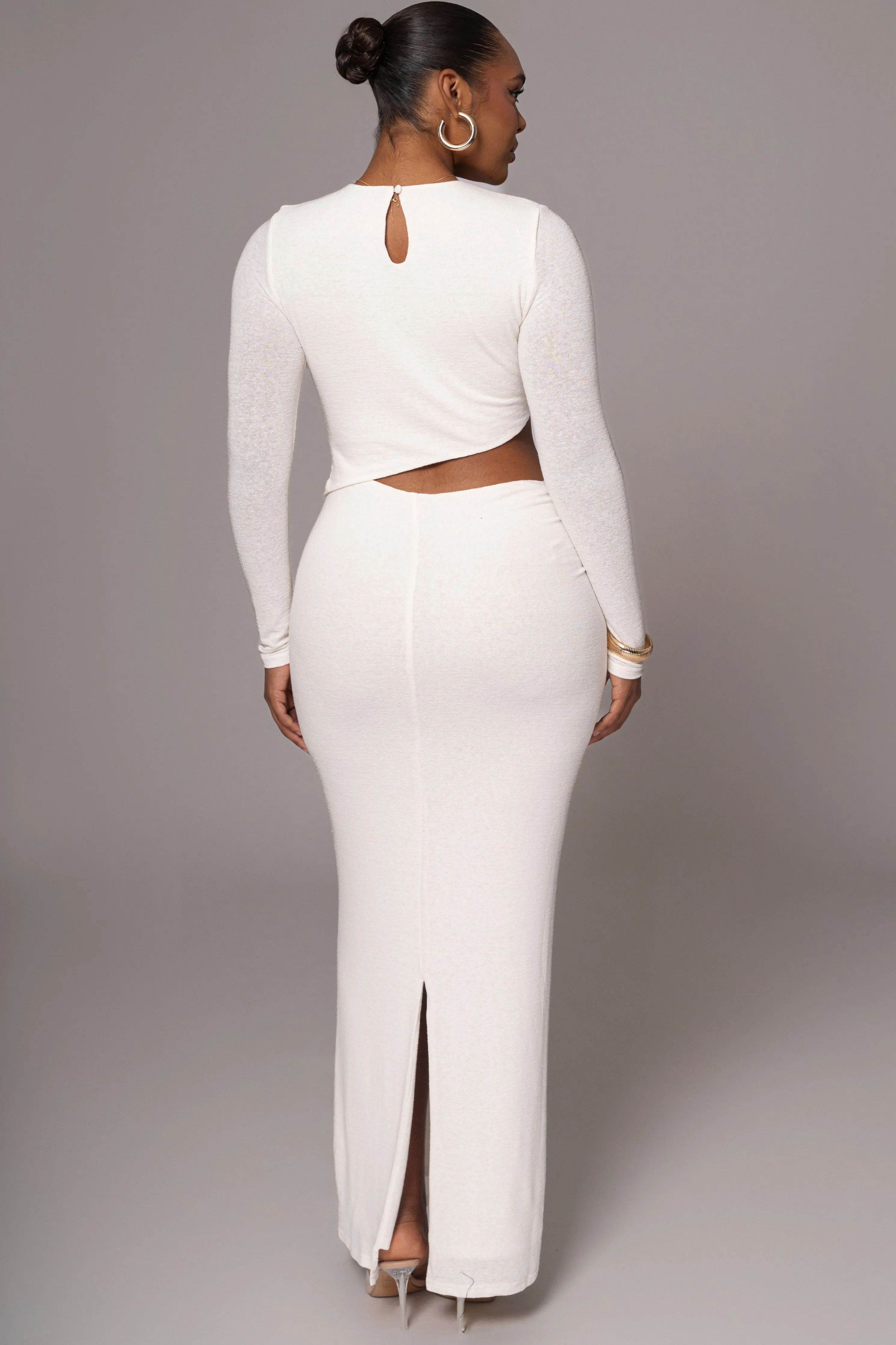 Experience the height of Fall elegance with our new White Summer Romance Cutout Dress. This long sleeve dress features a fitted silhouette that flatters your figure, while the center cutout adds a touch of allure. A gold-tone embellishment with acrylic stones at the side hip brings a unique and sophisticated edge. Crafted from a jersey knit fabric for quality and comfort. Complete with a back neck keyhole and a hidden side zipper closure for a seamless finish. Back slit hem. Double lined with medium stretch.
