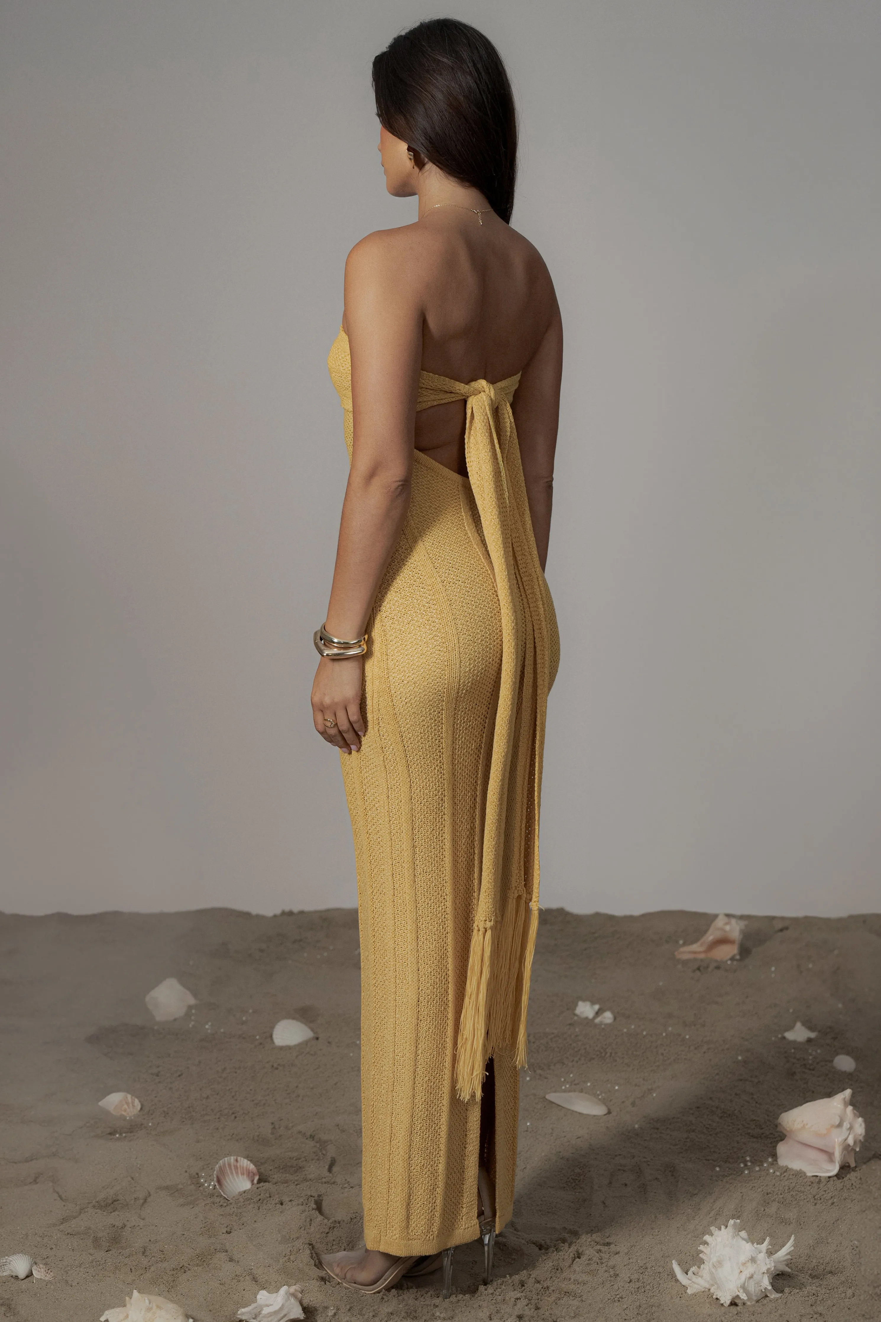 Unwind under the sun with our Yellow Blanca Strapless Maxi Dress. Luxuriously crafted in a soft knit, this maxi dress showcases a strapless neckline with a twist front design, an open back, and cascading multi-way back ties adorned with fringe trims. Stretchy. Single lined.
