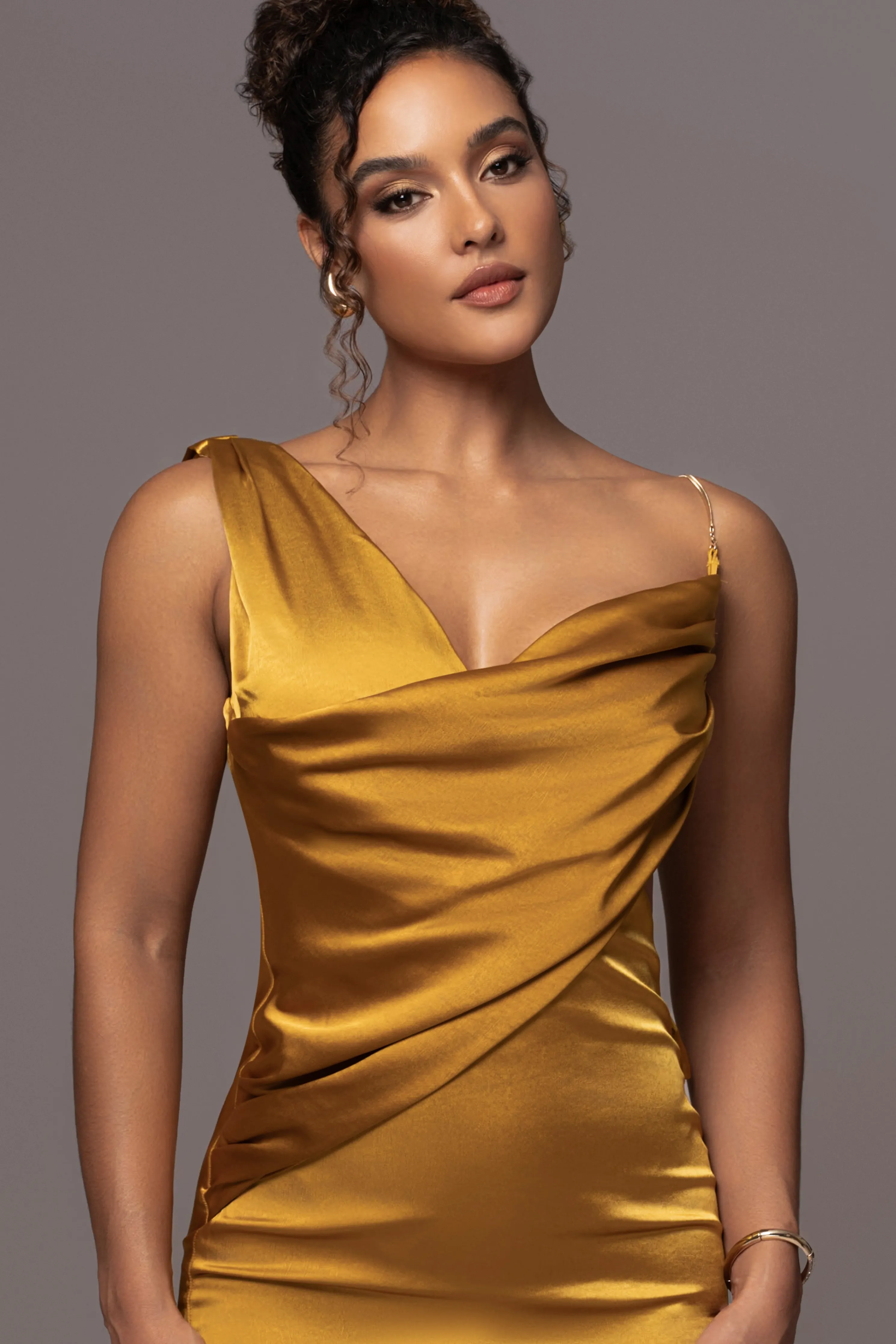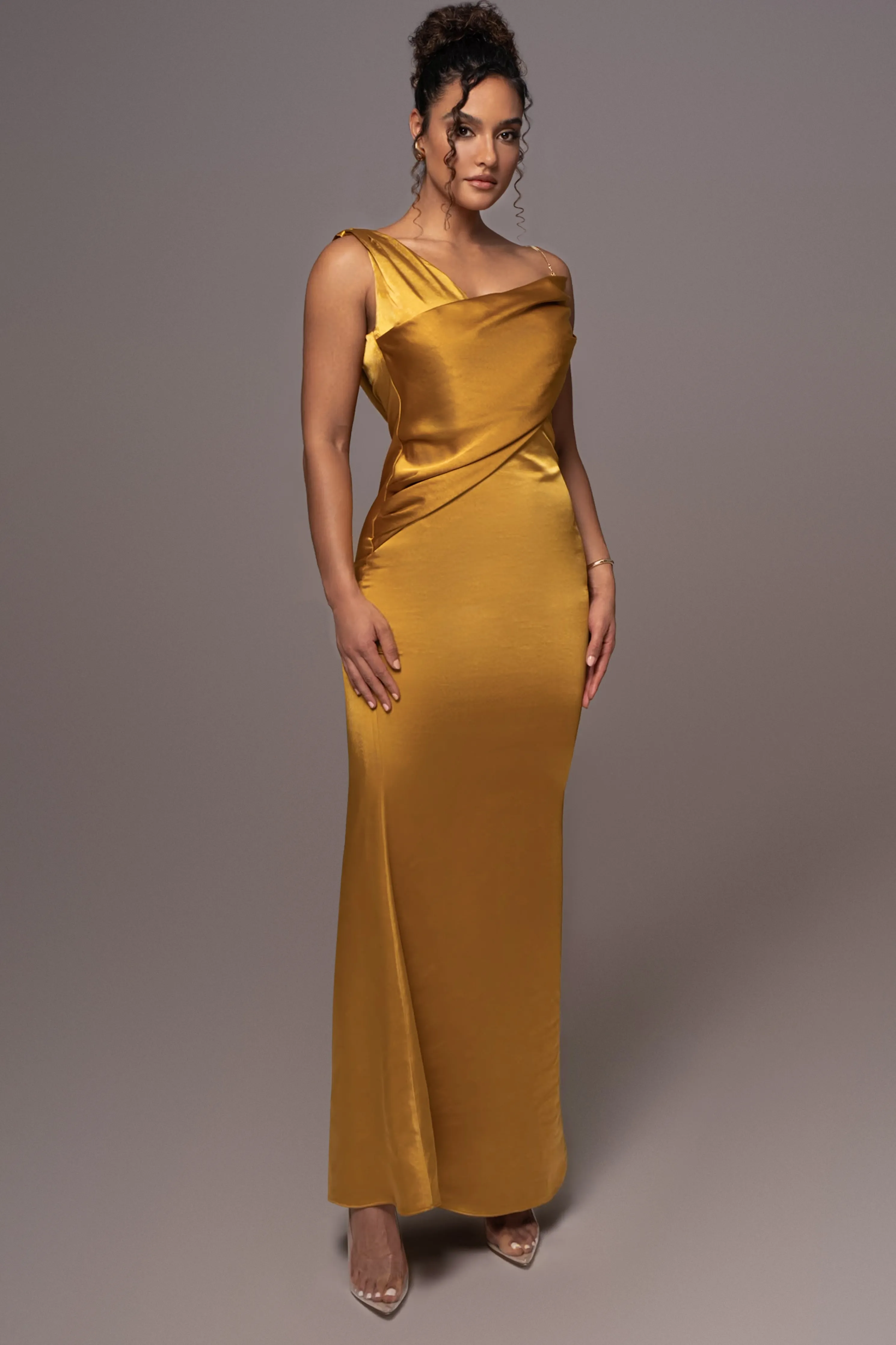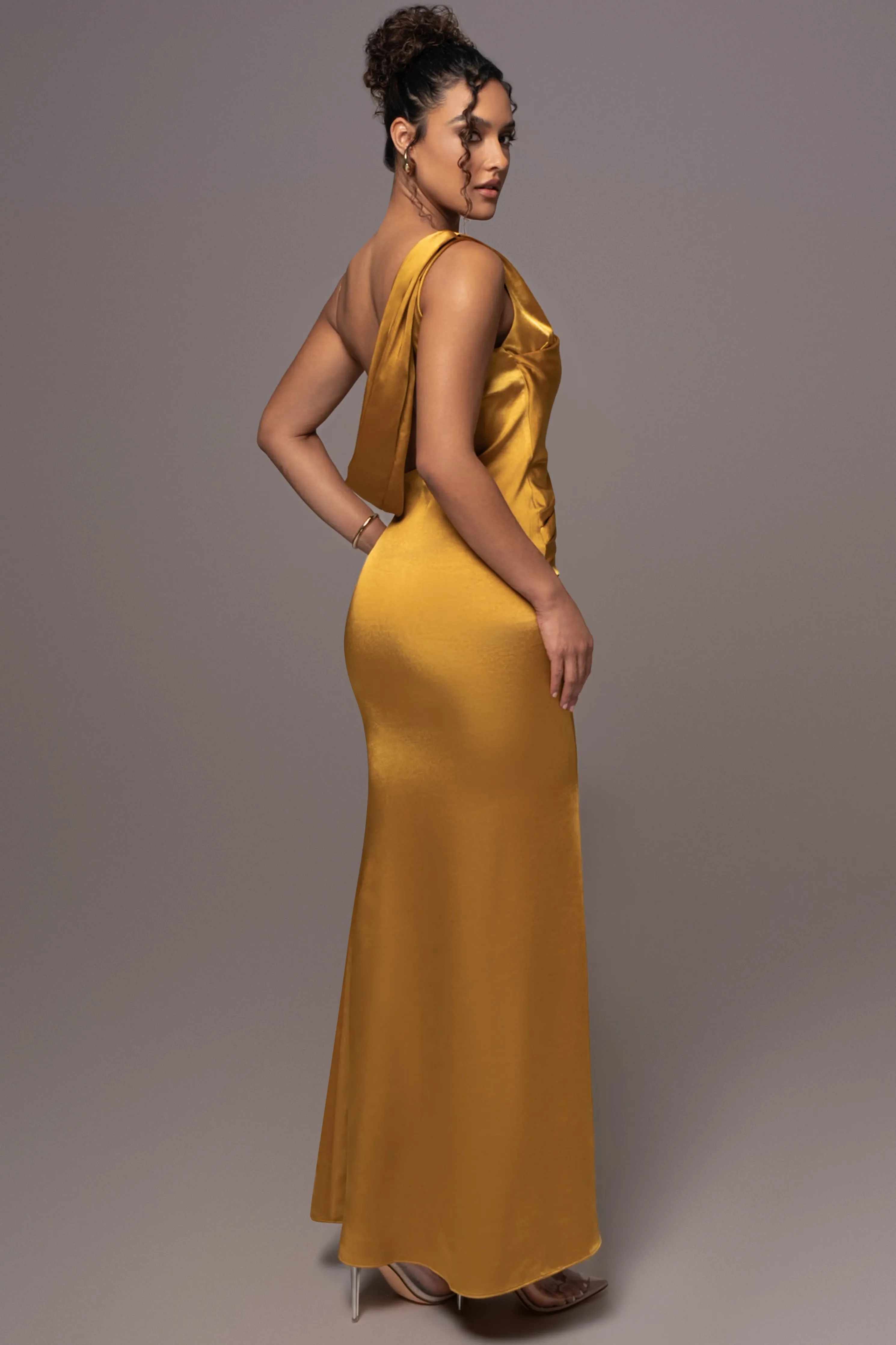 Introducing theYellow Satin Belle Maxi Dress, crafted from stunning satin fabric thatexudesshimmer and shine. This stunning maxi dress boasts a draped shoulder and an alluring open back, effortlessly achieving a fitted silhouette that flows into a mermaid hem. Gleaming gold-tone straps adorn one shoulder for extra elegance. Hidden side zipper. Double lined. No Stretch.