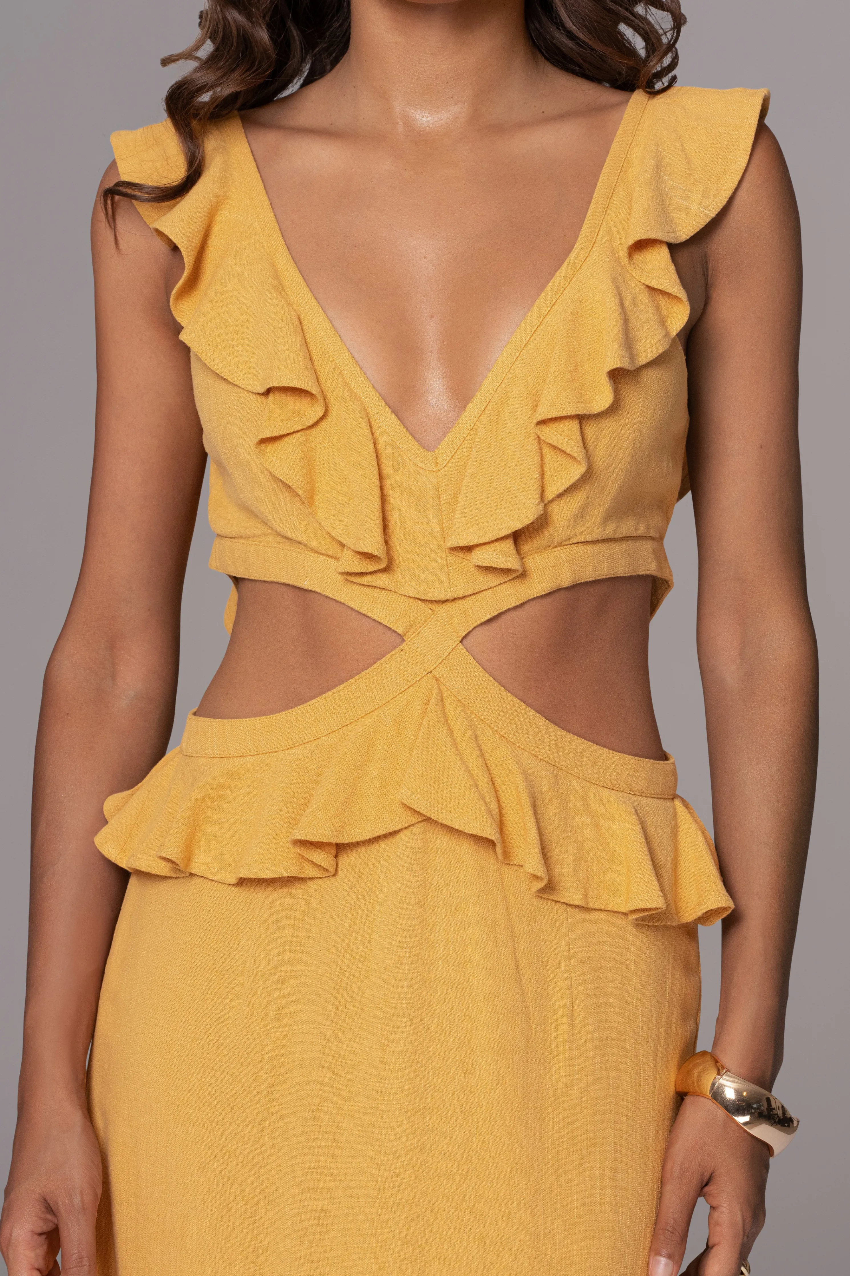 Bask in the radiance of the Yellow Sunshine Ruffle Linen Dress. This sleeveless maxi dress exudes elegance with a low V-neck and cutout waist adorned with ruffle trims, cascading into ruffle tiers towards the bottom hem. Crafted from a luxurious linen blend with double lining, it features a hidden back zipper closure and thin back ties. Back slit hem. No stretch.
