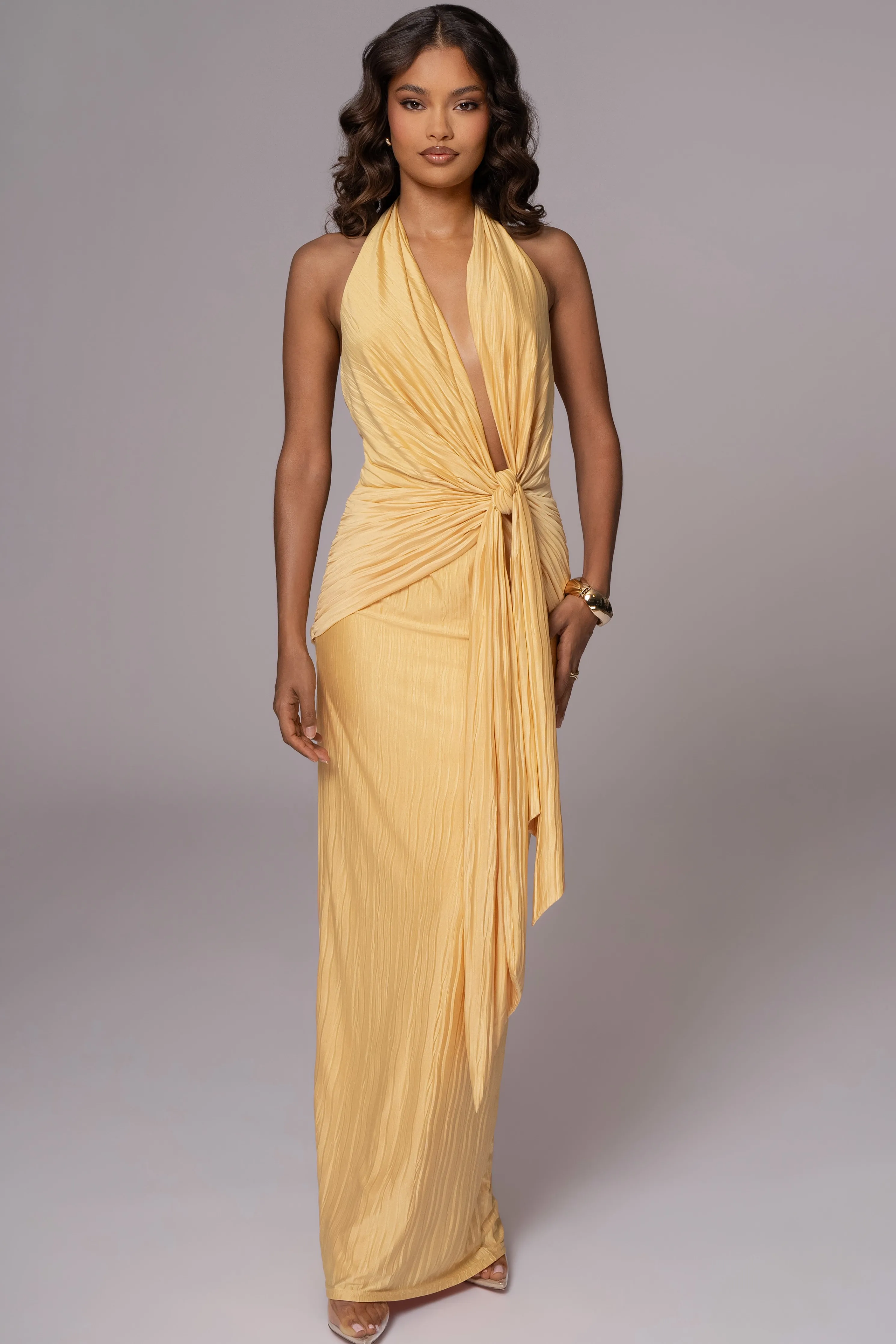 Introducing our Yellow Under The Moonlight Drape Dress, a stunning maxi dress that will make you stand out under the moonlight. Made with a lightweight crinkled fabric, this elegant maxi dress features a plunging halter neck, center gathering with a drape, and hidden side zipper closure. Complete with non-slip gel grip at the lower back and double lining for a luxurious and comfortable fit. Stretchy.